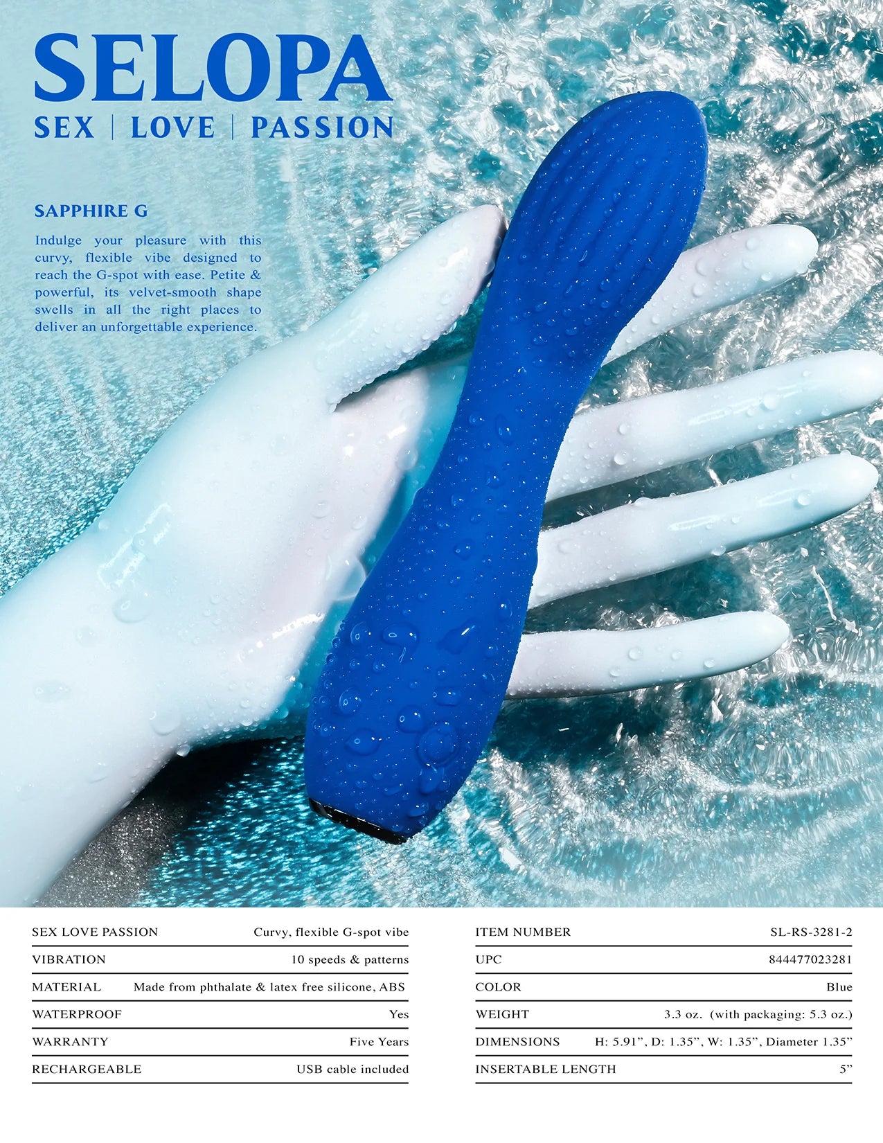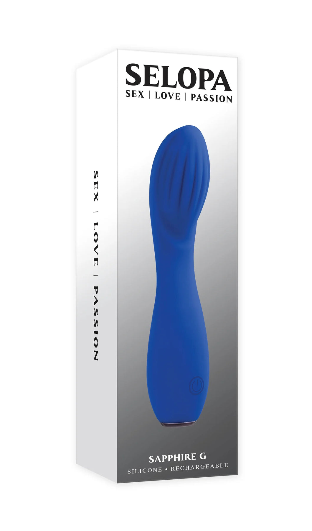 Selopa Sapphire G Vibrator from Evolved Novelties. Sex, love and passion. Indulge your pleasure with this curvy, flexible vibrator designed to reach the G-Spot with ease. Petite and powerful, its velvet smooth shape swells in all the right places to deliver an unforgettable experience.