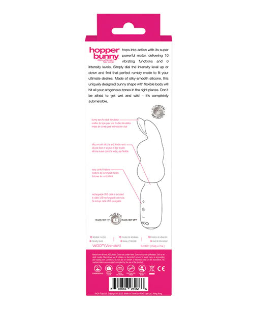 Vedo Hopper Rechargeable Mini Rabbit Vibe Pretty In Pink. Gold circle says - 1 million toys sold. Hopper Bunny hops into action with its super powerful motor, delivering 10 vibrating functions and 6 intensity levels. Simply dial the intensity level up or down and find that perfect rumbly mode to fit your ultimate desires. Made of silky smooth Silicone, this uniquely designed bunny shape with a flexible body will hit all of your erogenous zones in the all the right places. Do not be afraid to get wet and wild - it is also completely submersible. 100% Silicone. Travel Lock. Waterproof vibrations for play outside the bedroom. One year warranty. Categories: Vibrators, Clitoral Stimulators, Rechargeable Vibrators, Sex Toys for Women, Clit Cuddlers. 2023.