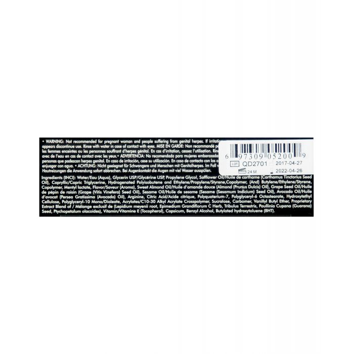 The intense fire and ice sensation for lovers. This exclusive formula made from natural extracts helps men unleash all the power and energy from their manhood all while sensitizing the female genital area to intensify her pleasure and help her achieve multiple orgasms. Intense Fire & Ice sensation. Made from all-natural extracts & herbs. Directions: The cream is applied prior to intercourse by massaging it all over the penis for about 30 seconds. Gently rub your shaft on your lover's genital area during foreplay and before penetration to allow her to feel the effect. As everyone is unique, the cream provides sensations that can greatly vary from one person to another. Not recommended for pregnant women and people suffering from genital herpes. Rinse with water of contact with eyes. Ingredients (INCI): Water/Eau (Aqua), Glycerin/Glycerine, Hydrogenated Polyisobutene (And) Ethylene / Propylene / Styrene Copolymer , (And) Butylene / Ethylene / Styrene Copolymer, Propylene Glycol, Safflower Oil/Huile de carthame (Carthamus Tinctorius Oil), Polyquaternium-7, Caprylic/Capric Triglyceride, Sweet Almond Oil/Huile d'amande douce (Prunus Dulcis Oil), Menthyl Lactate, Grape Seed Oil/Huile de pepin de raisin (Vitis Vinifera Oil), Sesame Oil/Huile de sesame (Sesamum Indicum Oil), Avocado Oil/Huile d'avocat (Persa Americana Oil), Flavor/Saveur (Aroma), Decaglycerol Decaoleate, Hydroxyethyl Cellulose, Acrylates/C10-30 Alkylacrylate Crosspolymer, Decaglycerol Oleate, L-Arginine, Carbomer, Proprietary Extract Blend of /Mecanyo proprietaire (Maca, Epimedium, Damiane, Tribulus), Sucralose, Vitamin/Vitamine E (Tocopherol), Vanillyl Butyl Ether, Capsicum OR, Benzyl Alcohol.