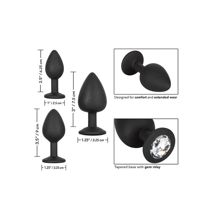Open the door of thrilling anal sensation with the Silicone Gem Anal Exerciser Kit™. This glamorous kit includes a set of 3 graduated anal plugs with a gem base to let you safely and comfortably increase passionate anal stimulation. To enjoy everything the exhilarating world of anal play has to offer, training is in order to ensure total safety and satisfaction. Each probe in our kit gradually increases in length and girth for superb pleasure at any level of pleasure play. While each increase of your training expands your horizons, use the sparkling gem adorned base for steamy stimulation, effortless insertion and gentle removal. The flexible probes are made from a smooth, seamless Satin Finish™ silicone. This body safe material is unscented and phthalate free to keep your most sensitive spots happy and healthy