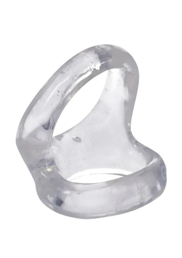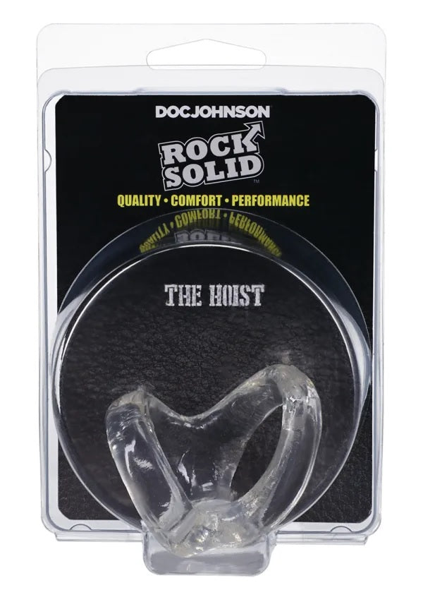 The Hoist is a dual cock ring with additional support for your balls. Designed for a comfortable, snug fit that helps maintain extra hard erections and maximize your performance. This TPE material allows for a light stretch to get it placed right. Rock Solid cock rings enhance size and thickness for longer, harder erections, and are completely body-safe. Approximate Product Dimensions: C-Ring, Width/Diameter: 1.75 in. (4.4 cm), Unstretched Inner Diameter: 1.18 in. (30 mm), Depth: 2 in. (51 mm),