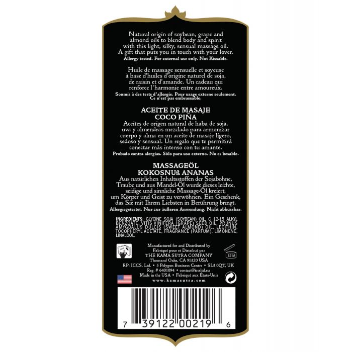 Kama Sutra's Natural Massage Oil is made with natural ingredients, blending the essence of fresh fruit with a special blend of body oils to create the perfect treatment for body and spirit. Kama Sutra Naturals offer the very best of nature's gifts to connect you with your lover, and help to be at one with nature. Coconut-Pineapple. 8 oz/236 ml bottle.