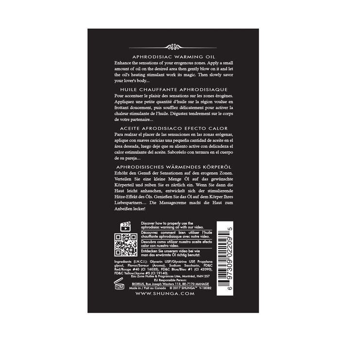 A delciious edible warming oil created especially to excite erogenous zones. Activate by the warm breath of soft intimate kisses. Perfect for use on the erogenous zones. Pour a small amount of the oil on the desired area and gently massage it into the skin. Softly blow on the oil to activate the product's heating properties. Use freely on any part of the body. Intoxicating Chocolate Ingredients (I.N.C.I.): Glycerin USP/Glycerine USP, Propylene glycol, Flavor/Saveur (Aroma), Sodium Saccharin, FD&C Red/Rouge #40 (CI 16035), FD&C Blue/Bleu #1 (CI 42090), FD&C Yellow/Jaune #5 (CI 19140).