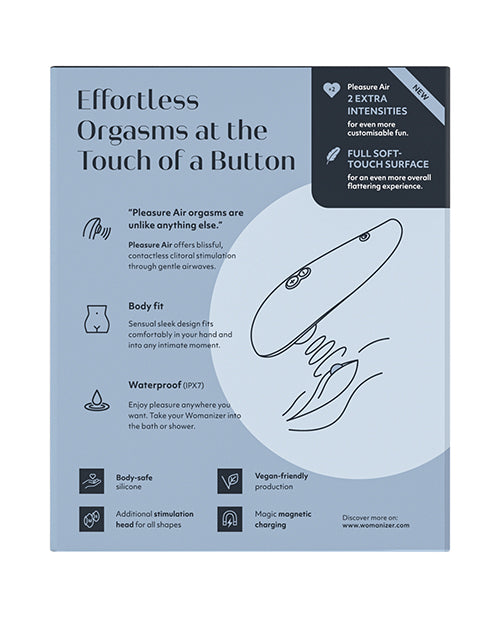 Simple and efficient, Womanizer CLASSIC 2 uses our ground-breaking, original Pleasure Air technology to offer effortless orgasms in record time. 10 Intensity levels - Whether you prefer soft and gentle or powerful and intense, or something in between – your next orgasm is just the push of a button away. The intensity levels are perfectly balanced and offer the right setting for your every mood. Afterglow - By short-pressing the power button, your toy quickly reverts to its lowest setting for a relaxing end to an orgasm. Extra Stimulator Head - We know that every body is different and beautiful! For this reason, every box includes two sizes of stimulator heads to ensure that everyone can enjoy their WOMANIZER.