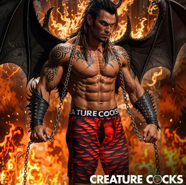 Creature Underwear: Upgrade your underwear with vibrant colors and fantasy themes! This pair of Horny Devil Underwear is covered in red scales with deep shadows. A demonic dong is centered on the crotch, enhancing your bulge.