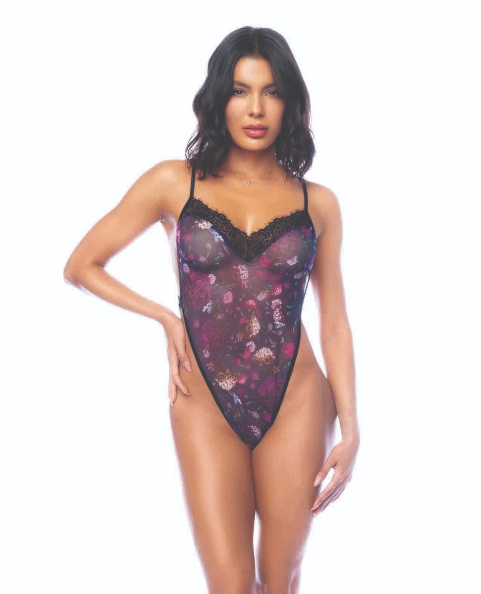 Floral print bodysuit, with eyelash lace trims, high cut, strappy back design, with adjustable straps and crotch fastening.
