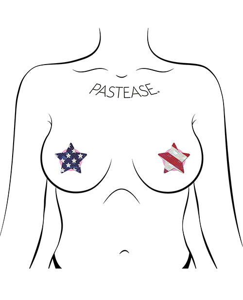 Petites: Two-Pair Small Glittering Stars & Stripes Star Nipple Pasties by Pastease® are hand-made in the USA of soft form-fitting material that forms seamlessly to curves and resists wrinkling over hardening nipples. Just peel-and-stick on clean, dry skin! All Pastease® pasties feature latex-free, medical-grade, waterproof adhesive that stays securely in place for as long as you like and until they are gently removed. Conceal or Reveal with Pastease® nipple pasties when worn with a sexy outfit, daring bikini, sheer top, revealing dress, Hefty bag, body lotion, crazy costume, party theme or nothing at all! Dimensions: 2 x 2 inches. Coverage: 1 inch.