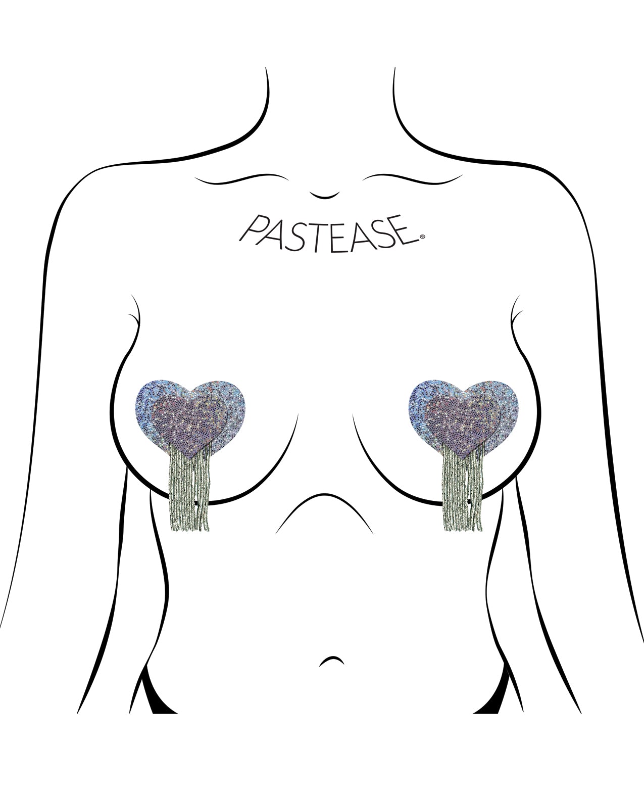 Love: Silver Glitter Heart Pasties with Tassels are hand-made in the USA of soft form-fitting glittery material that forms seamlessly to curves and resists wrinkling over hardening nipples. Just peel-and-stick on clean, dry skin. All Pastease® feature latex-free, medical-grade, waterproof adhesive that stay securely in place for as long as you like and until they are gently removed. Conceal or Reveal with Pastease® nipple pasties when worn with a sexy outfit, daring bikini, sheer top, revealing dress, Hefty bag, body lotion, crazy costume, party theme or nothing at all! Dimensions: 3 inches X 2.5 inches. Coverage Diameter: 1.8 inches.