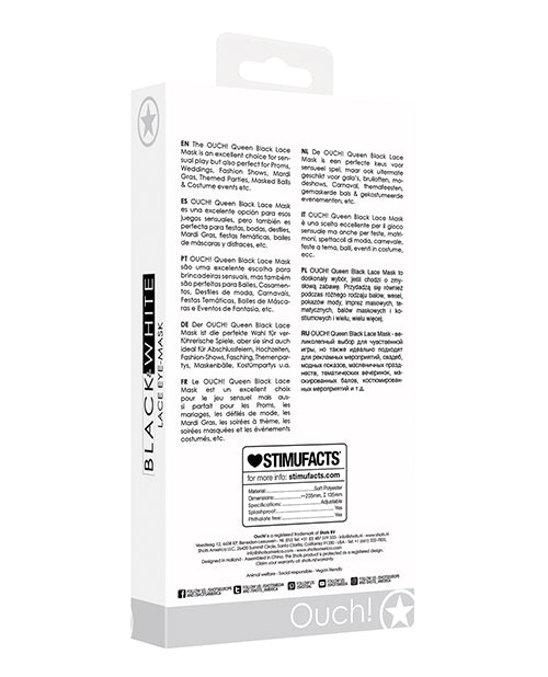 OUCH! Present’s a series of 4 handmade, high quality, lightweight and easy to wear masks, detailed with intricate modern Venetian inspired designs. Created with laser-cutting technology from the finest, eco-friendly materials, these masks will really give you an air of seductive mystery! Two quality ribbons will secure the mask in place for long hours of comfortable wear or play and facilitate easy adjustment. The OUCH! Queen Black Lace Mask is an excellent choice for sensual play but also perfect for Proms, Weddings, Fashion Shows, Mardi Gras, Themed Parties, Masked Balls & Costume events etc. Product dimensions: 9.06" x 5.12" x 0.04" Materials: Polyester.