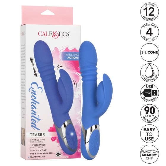 Enchanted Teaser Vibrator from Califonria Exotic Novelties. Bring a little magic to your bedroom with the Enchanted Teaser. Transport yourself to a wonderland of pleasure with 4 functions of shaft rotation, 4 functions of thrusting action, and 12 indulgent vibration functions. The flexible shaft and flickering stimulator move with your body to deliver intense G-Spot and Clitoral Stimulation. The seamless Ssilicone body and self healing charging port allow for powerful stimulation in and out of the water. Recharge the premium Silicone massager in 120 minutes with the provided USB charging cable to enjoy 50 minutes of high speed stimulation or 65 minutes of low speed vibrations. While the easy touch button pad controls the intensity and the curvaceous vibe gives you the stimulation you want, the integrated state of the art memory chip remembers just how you like it by starting on the last function used. The hypoallergenic premium Silicone is body safe, unscented and phthalate free to keep you most sensitive spots, happy and healthy.