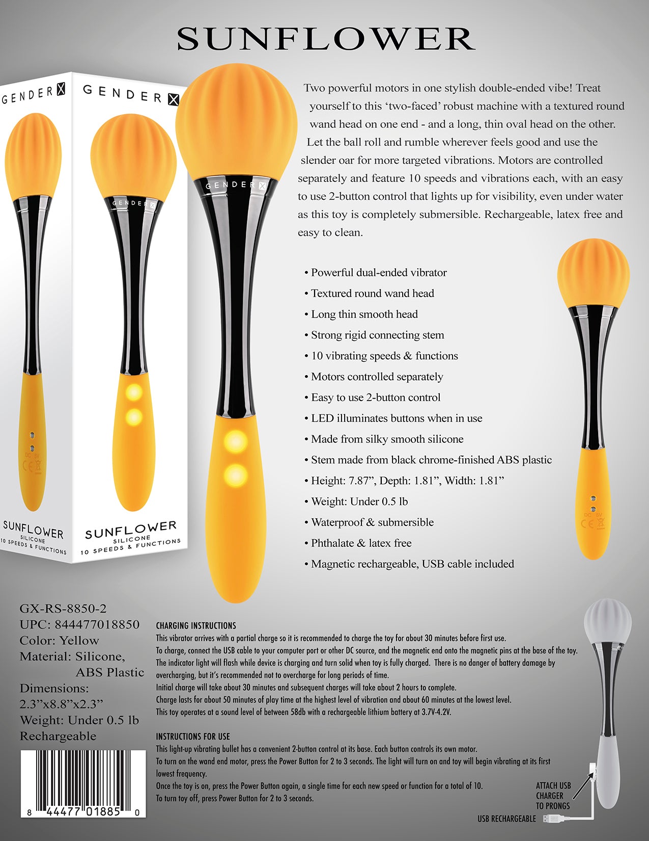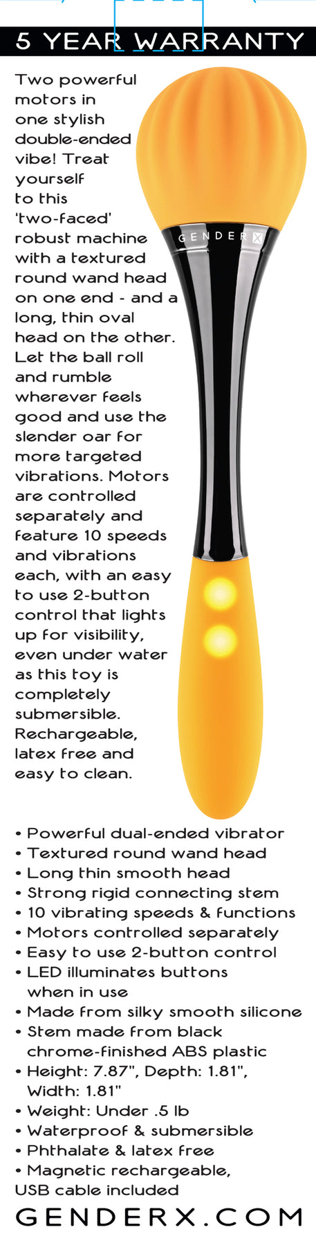 Gender X Sunflower Double Vibrator from Evolved Novelties. Two powerful motors in one stylish double ended vibe! Treat yourself to this two faced robust machine with a textured round wand head on one end and a long, thin oval head on the other. Let the ball roll and rumble wherever feels good and use the slender oar for more targeted vibrations. Motors are controlled separately and feature 10 speeds and vibrations each, with an easy to use 2 button control that lights up for visibility, even under water as this toy is completely submersible. Rechargeable, latex free and easy to clean.