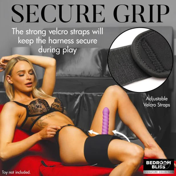 This sexy Lover's Thigh Harness lets your partner ride your thigh as they sit on top of you! It's made out of durable, stretchy neoprene. The material is smooth and provides padding. It's also absorbent in case they get really, really wet! Two velcro straps are on the back so you can easily put it on, take it off, or adjust it. It has a built-in, 1.5 inch O-ring already so you can easily slip in most strap-on dildos and play! Machine wash in cold water to preserve elasticity; tumble dry on low. You can also hand-wash if you prefer. Have your partner choose their favorite dildo, then slip it into the harness. As you strap it on your thigh, make sure it fits snug but not too tight. As they climb on, lube up the dong and invite them to use any toys they like., As they grind on you and ride you, enjoy being able to kiss them and play with them as they pleasure themselves and climax! Measurements: Overall: 22 inches Length x 10.75 inches Width. Adjusts from 15 inches to 21 inches thigh circumference. O-ring inner diameter: 1.5 inches. Materials: Neoprene Color: Black