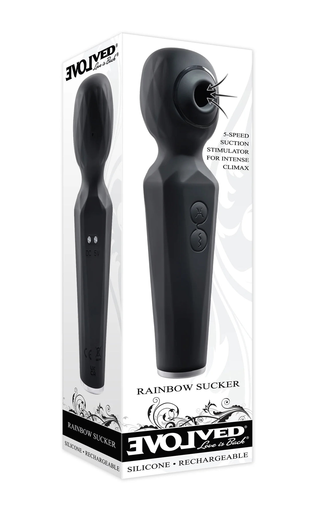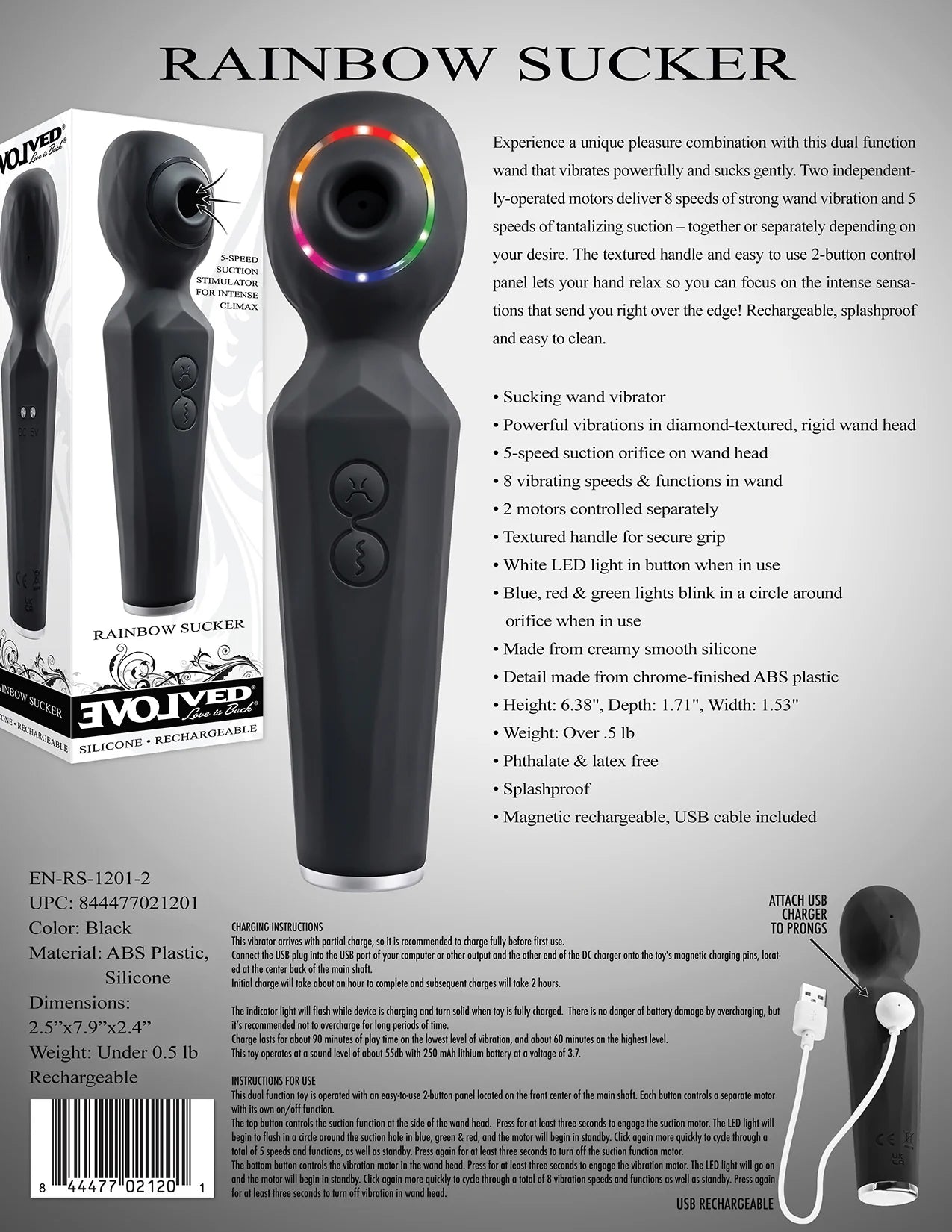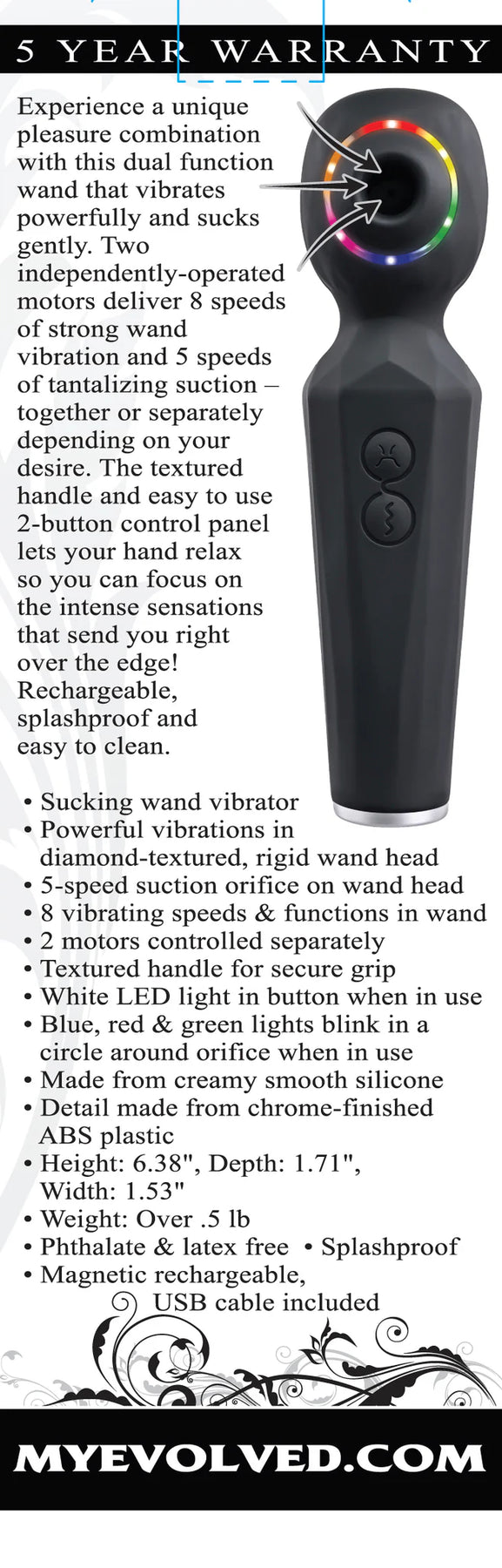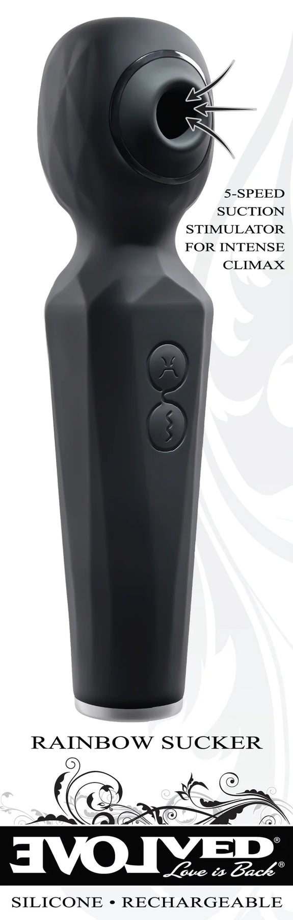 Evolved Rainbow Sucker Wand Vibrator. Experience a unique pleasure combination with this dual function wand that vibrates powerfully and sucks gently. Two independently operated motors deliver 8 speeds of strong wand vibration and 5 speeds of tantalizing suction, together or separately depending on your desire. The textured handle and easy to use 2 button control panel lets your hand relax so you can focus on the intense sensations that send you right over the edge! Rechargeable, splashproof and easy to clean.