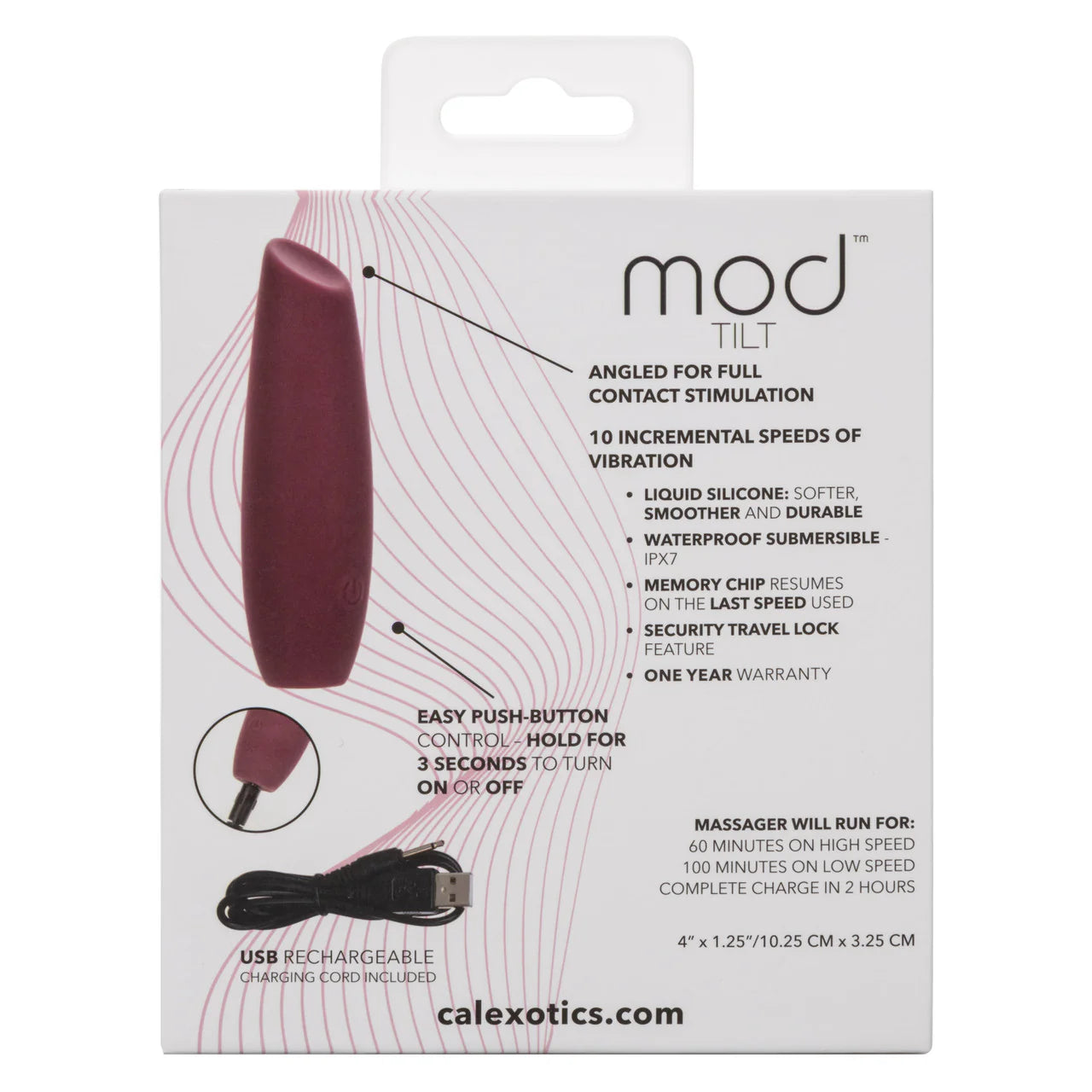 Mod Tilt Vibrator Pink Vibrator from California Exotic Novelties. Enter a journey to new sensory heights with the Mod Tilt, expertly angled for full contact stimulation that promises to leave no pleasure point untouched. This innovative massager is a blend of precise engineering and luxurious sensation, designed for those who seek a comprehensive and all encompassing experience. With 10 speeds of intense vibration, it offers a spectrum of rhythmic possibilities. From a gentle purr to a powerful roar, each setting is crafted to deliver deep satisfaction. The angled design ensures that it hits all the right spots with pinpoint accuracy, making every session an exploration of pure pleasure. Crafted from Liquid Silicone, this massager is a delight to the senses, boasting a material tha i's softer, smoother, and more durable than traditional Silicone. Fully waterproof with an IPX7 rating, it invites you to push the boundaries of pleasure, whether in the privacy of your bedroom or the indulgence of a steamy bath. The state of the art memory chip smartly resumes on the last speed used, ensuring a seamless continuation of your pleasure journey. Designed for both intimacy and ease of use, it features a security travel lock, ensuring your private delights remain discreet during your travels. USB rechargeable and complete with a charging cord, it is ready to go after just 2 hours of charging, providing 60 minutes of high speed sensation or a prolonged 100 minutes at a more leisurely pace. The Mod Tilt goes beyond brief excitement; it is an investment in deep and lasting pleasure. SKU: SE-0009-65-3. Color: Pink. 1 Year Warranty.