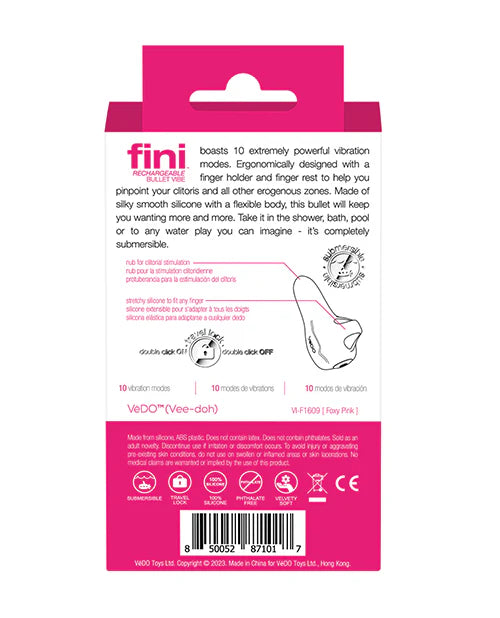 Vedo Fini Rechargeable Bullet Vibrator Pink. The FiniI boasts 10 extremely powerful vibration modes. Ergonomically designed with a finger holder and finger rest to help you pinpoint your clitoris and all other erogenous zones. Made of silky smooth Silicone with a flexible body, this Bullet Vibrator will keep you wanting more and more. Take it in the shower, bath, pool or to any water play you can imagine. It is completely submersible.