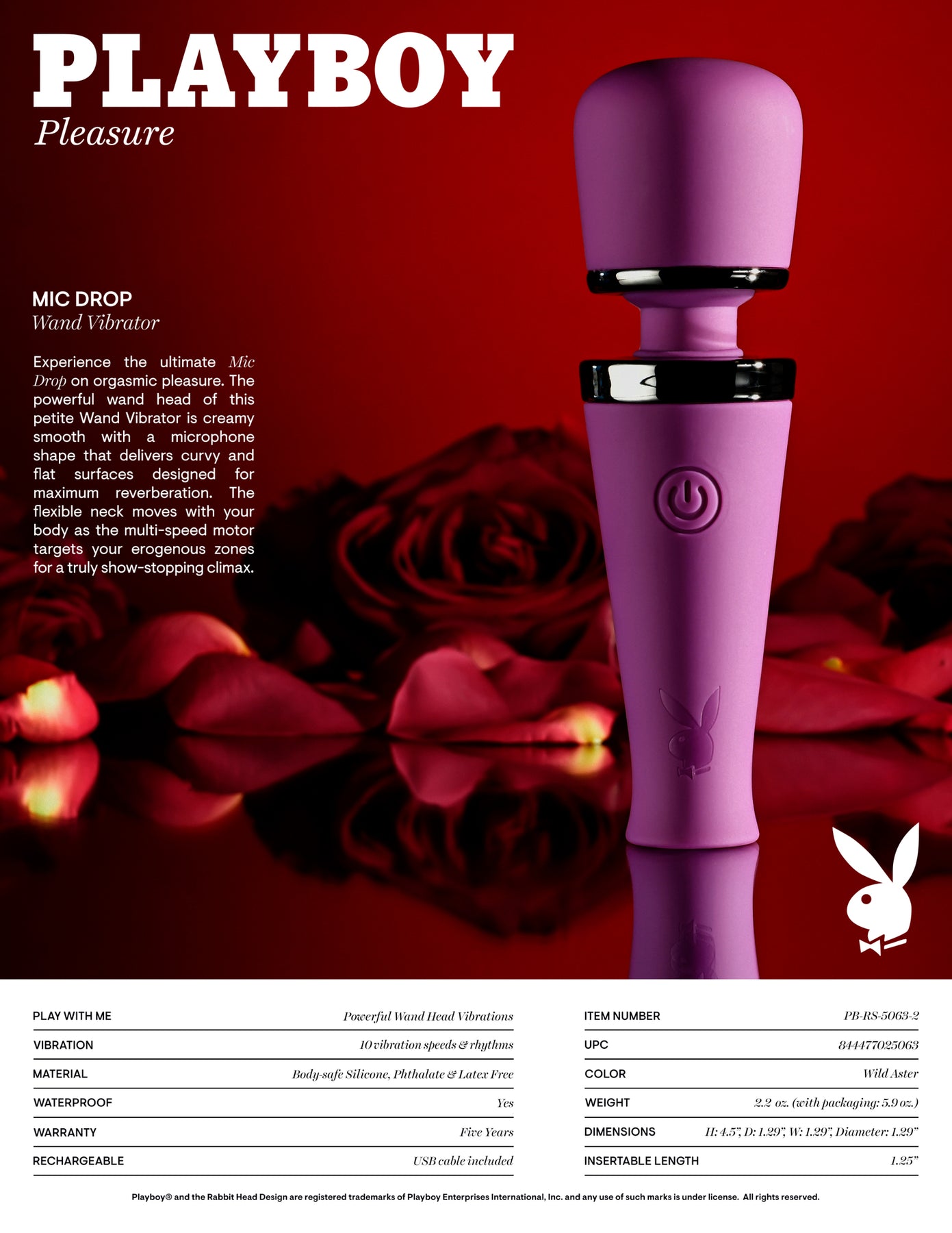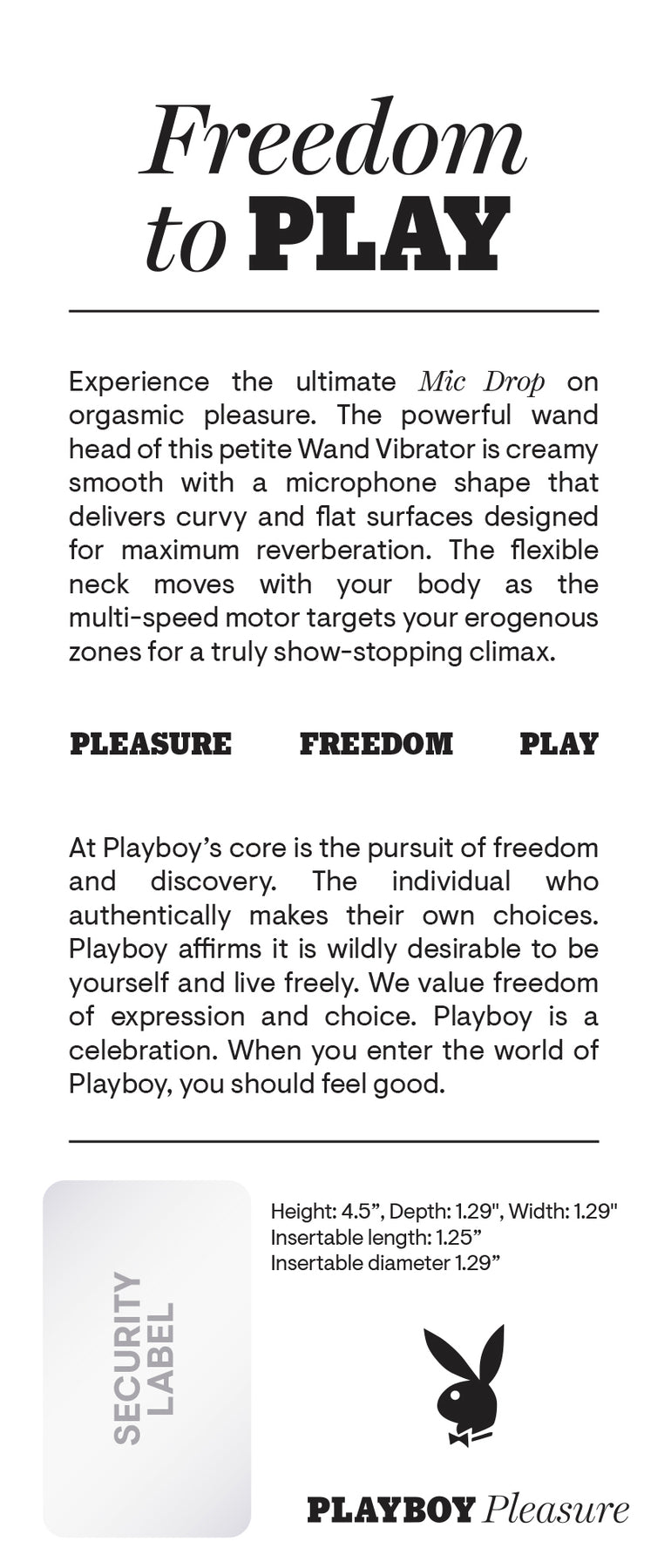 Playboy Mic Drop Massager from Evolved Novelties. Freedom to Play. Experience the ultimate Mic Drop on orgasmic pleasure. The powerful wand head of this petite Wand Vibrator is creamy smooth with a microphone shape that delivers curvy and flat surfaces designed for maximum reverberation. The flexible neck moves with your body as the multi-speed motor targets your erogenous zones for a truly show stopping climax. Panel details: Play with me key feature: Powerful Wand Head Vibrations. Vibration 10 vibration speeds and rhythms. Materials Body safe Silicone and chrome finished ABS Plastic, phthalate free and latex free. Waterproof. Warranty Five years. Rechargeable: USB cable included. Size