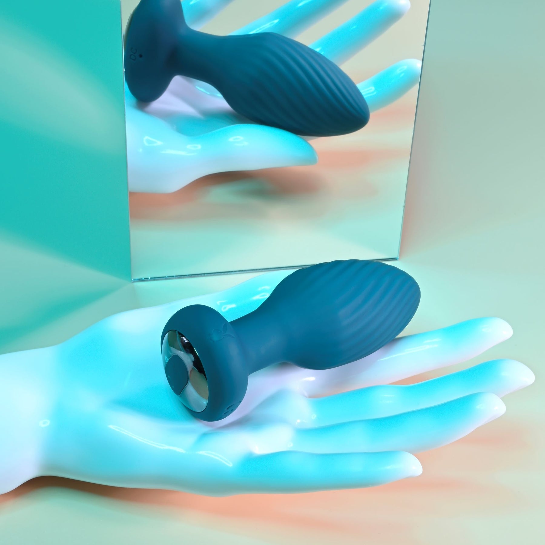 Specifications: Twirling, Textured Vibrating Butt Plug. Materials: Body safe Silicone, Phthalate free, Latex free. Size height 3.83 inches, depth 1.76 inches, width 1.38 inches. Insertion length 3 inches, diameter 1.35 inches. 7 vibrating, rotating speeds and rhythms. Press power button for 3 seconds to turn on/off. Additional button controls rotation. USB Rechargeable. 1 hour battery life. Charge time 90 minutes. Remote Control included. 25 feet range. Remote uses 1 CR 2032 battery. Please only use a water based personal lubricant. Always clean before and after use. Rinse with warm water. Pat dry before storing. Waterproof vibration. Submersible for easy cleaning and play outside the bedroom. 5 years manufacturer's warranty. Categories: Anal Toys, Small, Medium Butt Plugs, Vibrators, Classic Vibrators, Rechargeable Vibrators. Play with me. Playboy and Rabbit Head design are registered trademarks of Playboy International. All rights reserved. 2023.