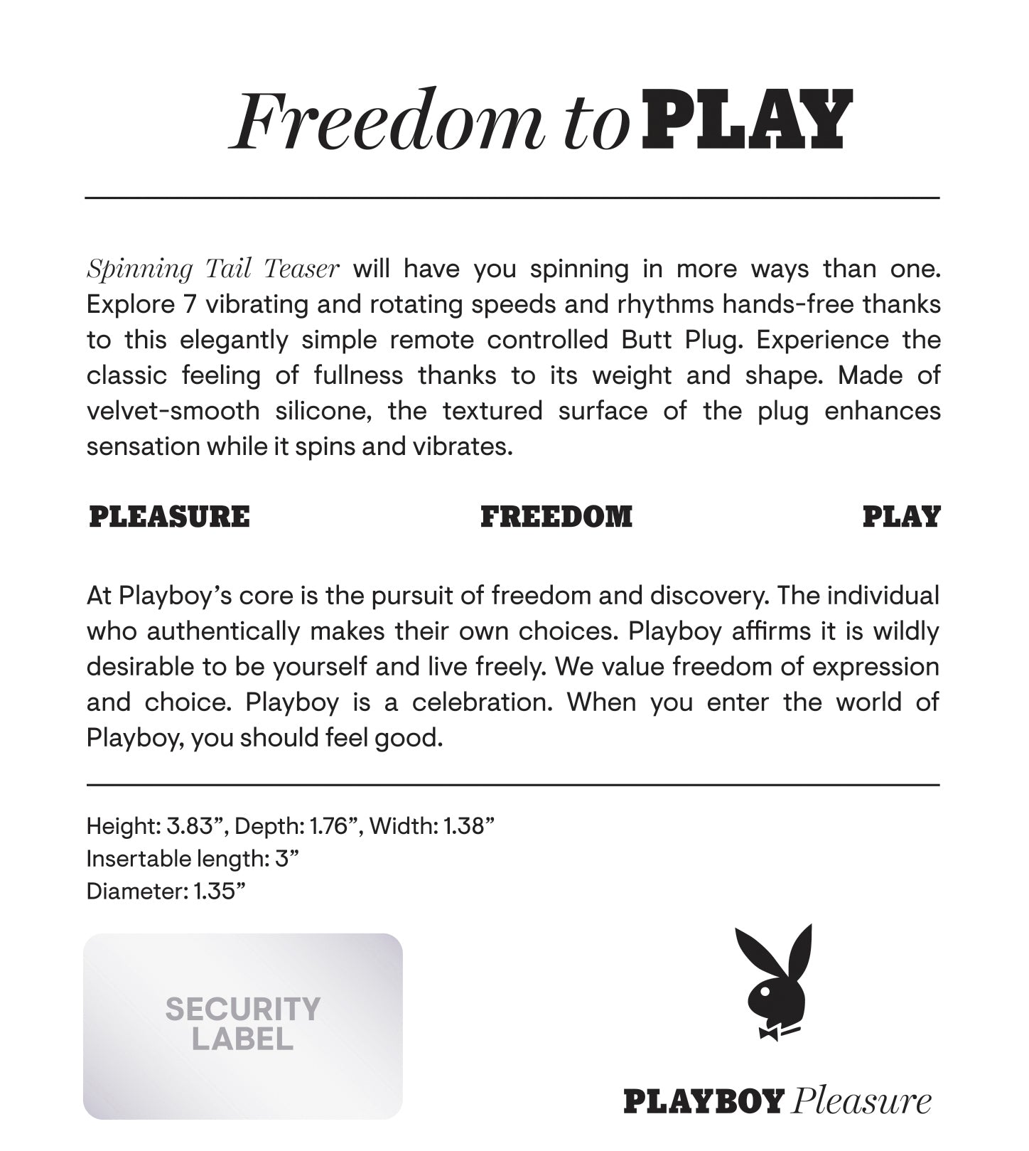 Playboy Spinning Tail Teaser Butt Plug from Evolved Novelties. The freedom to play is yours with Playboy Pleasure. Spinning Tail Teaser will have you spinning in more ways than one. Explore 7 vibrating speeds and rhythms hands free thanks to this elegantly simple remote controlled Butt Plug. Stimulate more nerve endings and enjoy more pleasure than ever with 7 twirling speeds that send the plug in a circular motion. Experience the classic feeling of fullness thanks to its weight and shape. Made of velvet smooth Silicone, the textured surface of the plug enhances sensation while it twirls and vibrates.