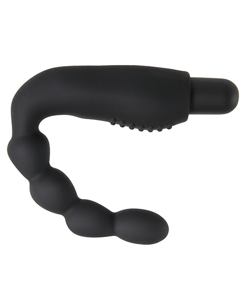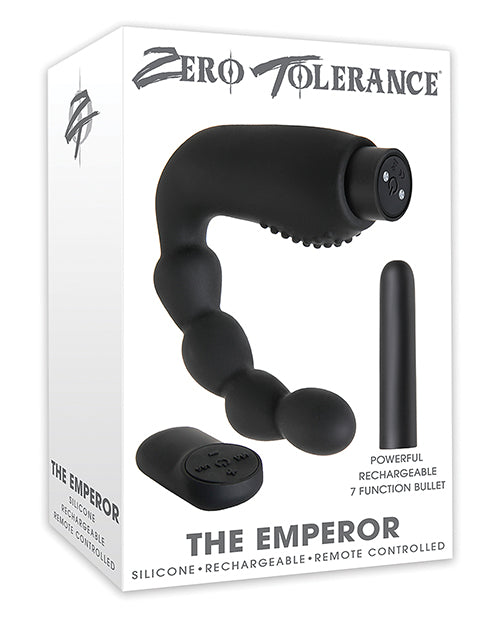 The Emperor from Zero Tolerance. Who says you can not have it all? This unique men's toy cradles the penis and balls with two separate rings, while an attached vibrating butt plug works its magic simultaneously! Remote controlled vibrating beaded prostate toy. 7 vibrating functions, removable bullet. Anal stopper for safety. Waterproof vibrations and submersible. Materials Silicone probe, ABS plastic remote control. Dimensions length overall 4.09 inches, insertion length 3.97 inches, diameter .91 inch. Remote control uses one CR2032 battery, included. USB rechargeable vibrations, cable included. 5 year warranty.