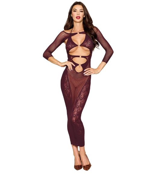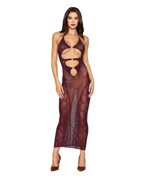 Seamless knitted bodystocking gown and separate shrug set, Knitted lace and fishnet patterns, halter neck ties and keyhole cutouts with ring details, Thong not included.