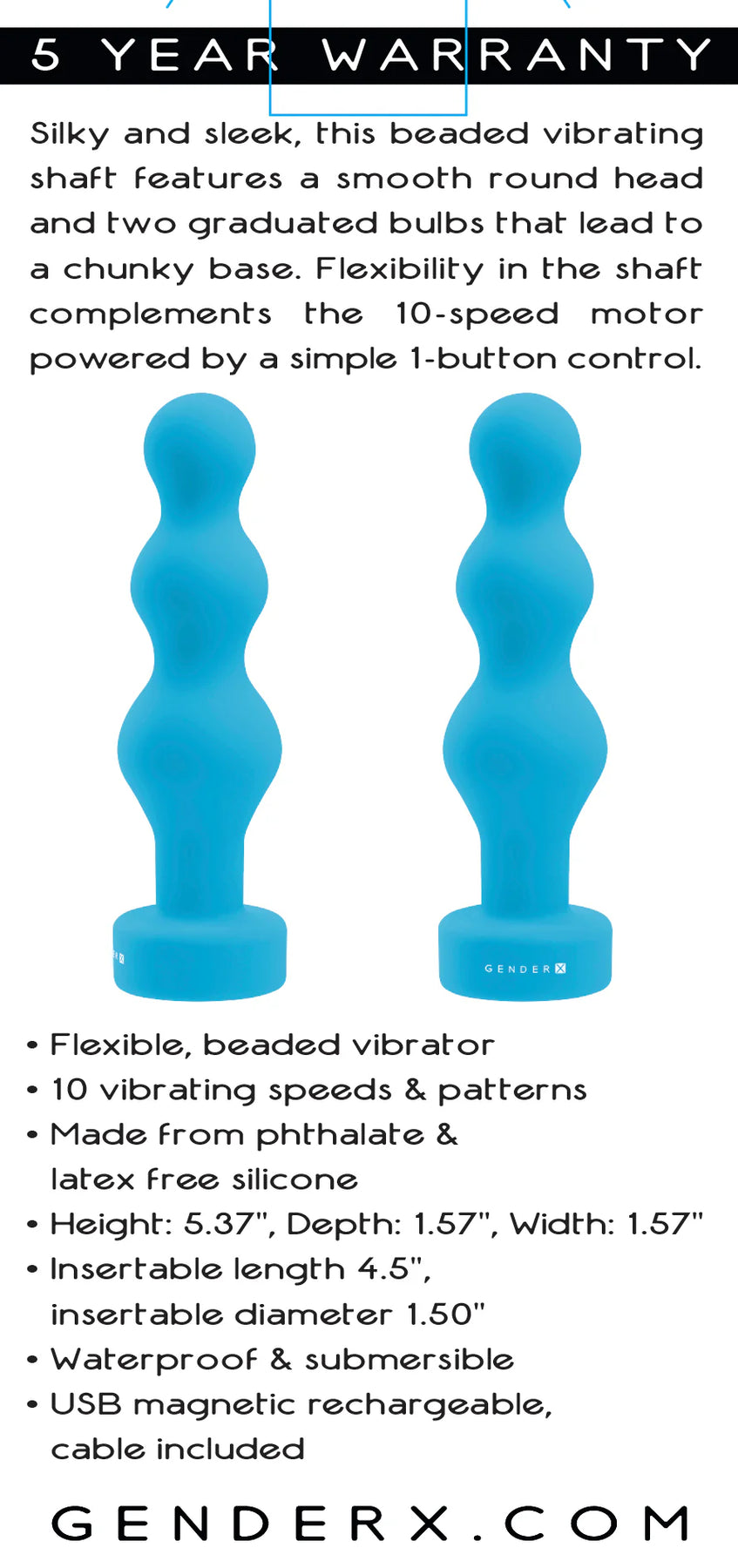 Gender X Plugged Up Beaded Vibrating Anal Plug from Evolved Novelties. Silky and sleek, this Beaded Vibrating Shaft features a smooth round head and two graduated bulbs that lead to a chunky base. Flexibility in the shaft complements the 10 speed motor powered by a simple 1 button control.