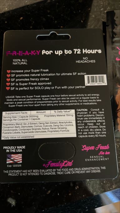 Super Freak For Her 1 Piece Capsule for enhancement. Freaky for up to 72 hours. 100% all natural ingredients. No headache. Increase your super freak. Increase natural lubrication Super Freak. Super freak promotes frenzy climax. Promotes natural lubrication for the ultimate Super Freak action. Super Freak frenzy climax SF is Super Freak approved. Super Freak For Her solo play or fun play with your partner. Super Freak Intimate Youth for Her. Increases desire. Strengthens without feeling tired. Boosts self confidence due to a stable performance. Increases different and multiple levels of orgasm. Decreases issues and illnesses in the woman’s reproductive system. Usage: take one packet one hour before sexual activity to aid energy, libido sexual performance. Super Freak For Her can be used on a regular basis to maintain a peek condition. For best results take Super Freak one hour apart from taking supplements or medication. Consult a physician if you have heart problems. Discontinue use immediately if any undesirable effects occur. Keep out of reach of children. Store in a cool dry place. Do not use more than one capsule. Supplement facts: Servings per container 1. 3000mg per serving. Propriety materials 750mg. Propriety blend: Go Ji Extract, Deng Sen Extract, Attractylodes, Cinnamon Bark, Dismutase, Cornus, Cuscuta, Dang Gui, Licorice, Condonopsis, Cordyceps Sinesus, Rubus, Panax Ginseng, Pueraria Lobata, Superoxide Dismutase, Proprietary formula. These statement have not been evaluated by the Food and Drug administration. This product is not intended to diagnose, treat, cure or prevent any disease. Made in the USA. Categories: Meds, Supplements, Sex Pills, Health and Beauty Aids, Sex Toys for Women. 2023.