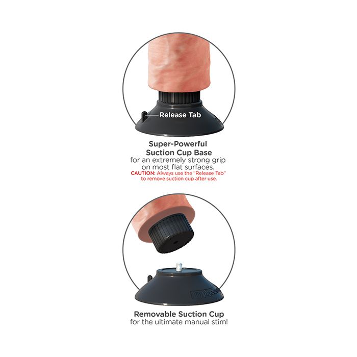 Do you want your first vibrator to look and feel just like the rock-hard stud you've always fantasized about? Stop dreaming and get down with the King! Every vein, every shaft, and every head is handcrafted with exquisite detail to give you the most realistic experience ever imagined. Featuring a posable spine, simply bend the cock to your favorite shape to hit just the right spot every time. Amp up the pleasure with a simple twist of the multi-speed dial for ultra-powerful vibrations that will blow you away. You can even take this waterproof vibe into the shower, hot tub or spa and turn bath time into playtime! The super-strong suction cup base sticks to nearly any smooth, flat surface and offers harness compatibility for strap-on fun. Stick it to the floor, wall, tile, or bedpost and it will stay securely in place. Always use the release tab to remove the suction cup after use. The suction cup can be removed from the vibe by simply unscrewing it from the base for easier handling during manual play.