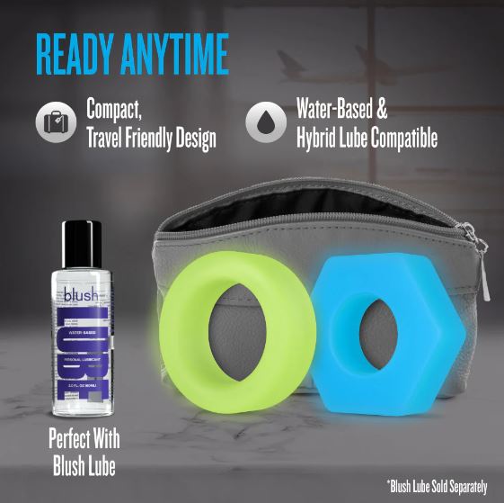 Maximize and boost pleasure with Performance® Plus Flash! This premium 2-ring set strengthens stamina, maintains firmer erections, and extends playtime. Flash glows in the dark, adding a bold and playful twist to every session. Whether you're enhancing solo moments or turning up the heat with a partner, Flash brings the spark. Crafted from Purio® platinum-cured liquid silicone and wrapped in an UltraSilk® satin smooth finish, these rings are strong, soft, and super stretchy for a secure, comfortable fit. The glow effect adds visual excitement, while the flexible design adapts to most sizes with ease. Flash keeps you in control and lit for the ride.
