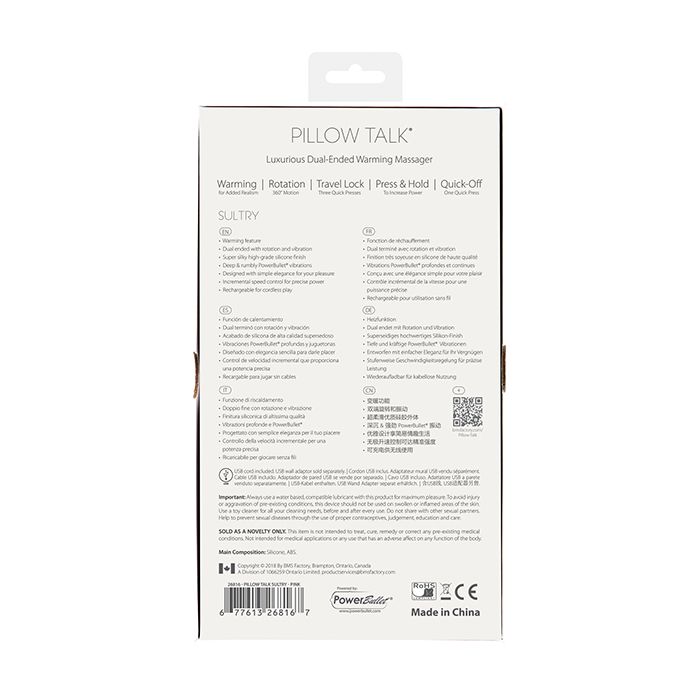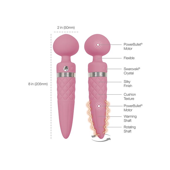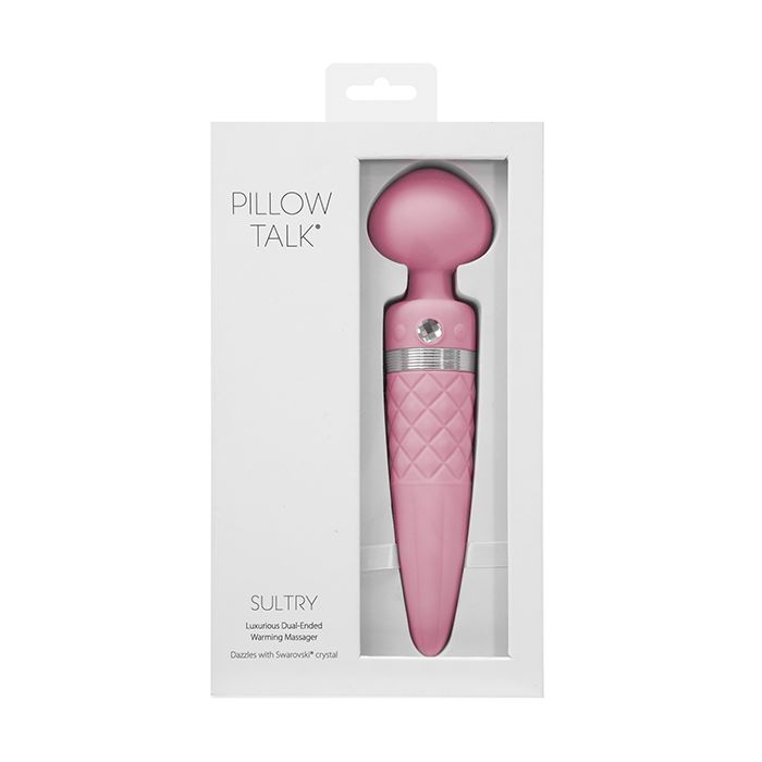 Sultry by Pillow Talk has a smooth rounded head and provides powerful vibrations. It has a tapered insertable handle that rotates 360 degrees for incredible G-spot stimulation. The rotating shaft of Sultry also offers a premium warming feature for added comfort and realism. Key Features: Two independent motors: vibration and rotation. Dazzles with Swarovski crystal Deep and rumbly PowerBullet vibrations. Designed with simple elegance for your pleasure. Warming shaft for added realism. Rotating shaft with 360 degree motion. Flexible neck A special white, small bristle brush is included inside the box for effectively cleaning the grooves of this sex toy. Material: Silicone USB rechargeable, cord included. Charge time - 2.5 hours Run time- up to 1.5 hours Travel Lock Dimensions: Overall Length - 8 inches Width of head - 2 inches