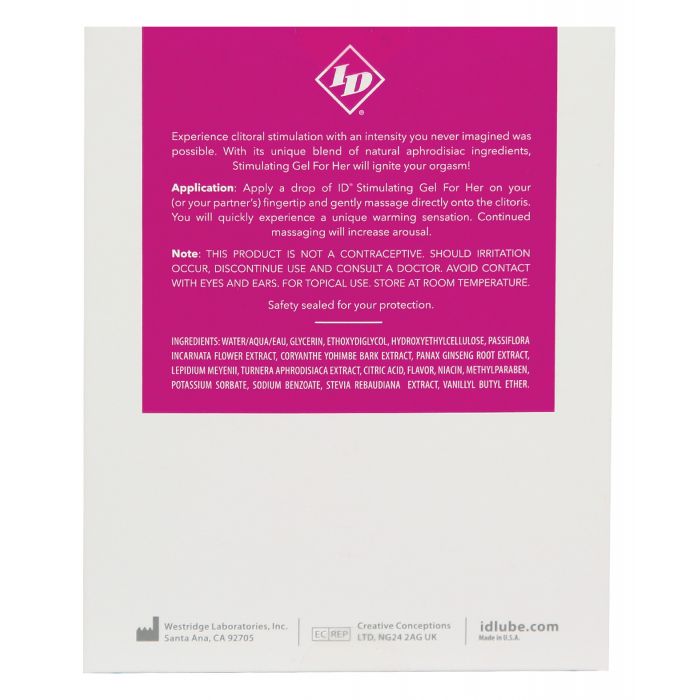 For some of the best female stimulation and enhanced arousal, ID Stimulating Gel for her is the perfect choice! Feel as this exquisite stimulating gel works its magic on and throws you into fits of orgasmic pleasure. Offering a unique gel aimed to heighten female arousal complements our line of products designed for your pleasure. Using this product will make you more than a little enthusiastic when engaging in acts leading of an erotic nature. Feel the passion of your next tryst come alive in exceedingly exciting ways. This clitoral stimulating gel will take you into space! Ingredients: Water/Aqua/Eau, Glycerin, Ethoxydiglycol, Hydroxyethylcellulose, Passiflora Incarnata Flower Extract, Coryanthe Yohimbe Bark Extract, Panax Ginseng Root Extract, Lepidium Meyenii, Turnera Aphrodisiaca Extract, Citric Acid, Flavor, Niacin, Methylparaben, Potassium Sorbate, Sodium Benzoate, Stevia Rebaudiana Extract, Vanillyl Butyl Ether.