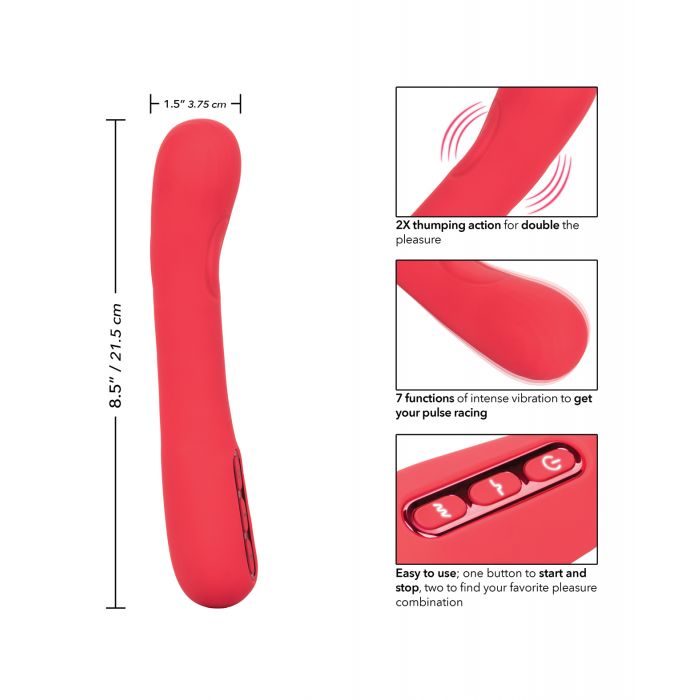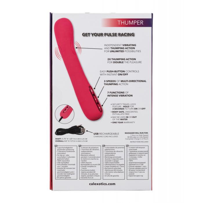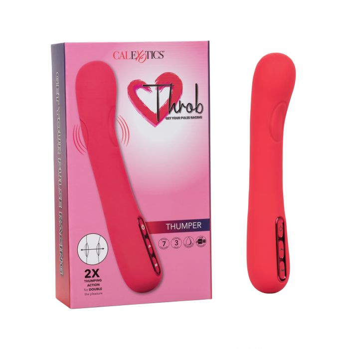 With 2 times the powerful thumping action, the thrilling Throb Thumper is made to get your pulse racing. This powerful massager has 2 uniquely placed thumping pads on both sides of the shaft to deliver deep, rumbling thumping. Embrace fully personalized pleasure with independently controlled 3 speeds of thrilling thumping action and 7 intense functions of vibration. The pulsating curved tip delivers 3 thrilling speeds of thumping sensation that redefine pleasure. The easy-touch 3-button control lets you cycle through the knee-shaking settings. Recharge the premium silicone vibrator in 2 hours with the provided USB charging cable to enjoy 60 minutes of high-speed stimulation or 80 minutes of low speed vibrations. The self-sealing charging port and silicone body let you get steamy with this waterproof vibe. The hypoallergenic premium silicone is body safe, unscented and phthalate free to keep you most sensitive spots, happy and healthy.