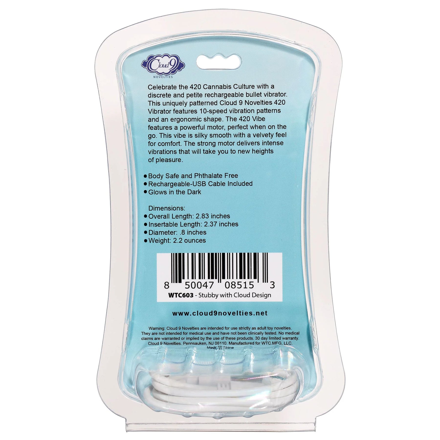 420 Stubby Vibe White Blue Cloud from Cloud 9 Novelties. Celebrate the cannabis culture with a discreet and petite rechargeable bullet vibrator. This uniquely patterned Cloud 9 Novelty 420 Vibrator fearures 10 speeds of vibration patterns and an ergonomic shape the 420 Vibe features a powerful motor. Perfect when on the go. This Vibe is silky smooth with a velvety feel for comfort. The strong motor delivers intense vibrations that will take you to new heights.