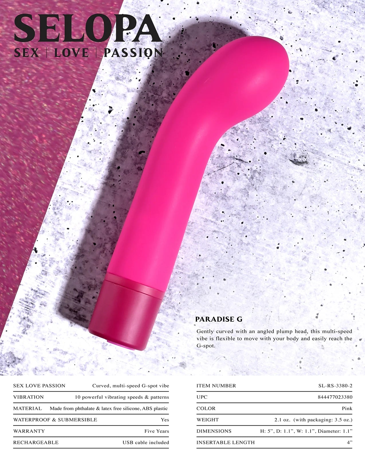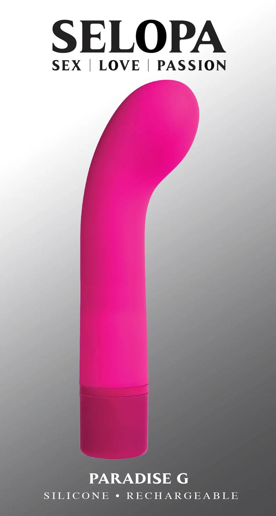 Selopa Paradise G Pink Silicone G-Spot Vibrator from Evolved Novelties. Sex, love and passion. Paradise G Vibrator is gently curved with an angled plump head, this multi-speed vibe is flexible to move with your body and easily reach the G-Spot. Sex, Love, Passion key features: curved, multi-speed G-Spot Vibrator. Vibration: 10 powerful vibrating speeds and patterns. Materials: made from body safe phthalate free and latex free Silicone shaft, ABS Plastic Base. Waterproof vibrations. Submersible for play outside the bedroom. 5 years warranty. Rechargeable vibrator, magnetic USB, cable included. Size: height 5 inches. Depth 1.1 inches. Width 1.1 inches. Diameter 1.1 inches. Insertable length 4 inches. Bulk weight 2.1 ounces. Packaging with Vibrator 3.5 ounces. Categories: Vibrators, Rechargeable Vibrators, G-Spot Vibrator, Sex Toys for Women, G-Spot Flexible Vibrators. 2023.