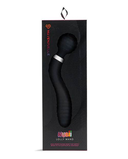 Sensuelle Nubii Lolly Wand Massager Vibrator Black from NU Sensuelle Novelties. With 10 speeds per end, the Lolly wand delivers a flood of never ending pleasure. Powered by the Nubii motor, Lolly produces a buzzy and subtle gyration sensation, allowing for comfortable and lip quivering orgasms in every session. With an enchanting shape and spherical head directly targeting the clitoris, this Dual Ended Flexible Wand is also easily insertable for satisfying G-Spot stimulation. The subtle texture adds another layer of nuanced bliss. Everyone deserves pleasure and unforgettable orgasms at a fair price, and the Lolly Wand certainly makes that achievable. Includes satin carrying pouch. USB rechargeable. Water Submersible.