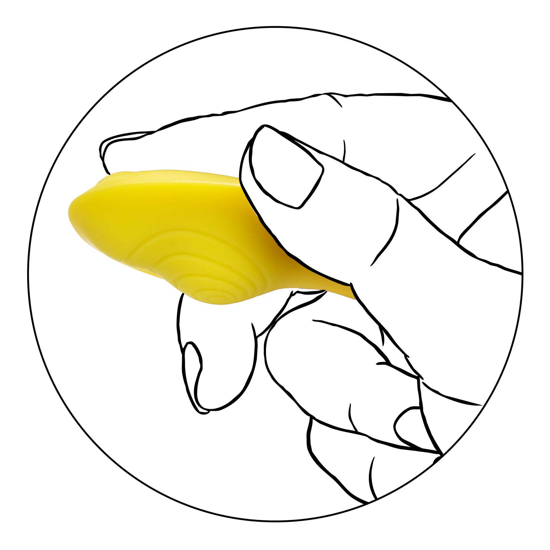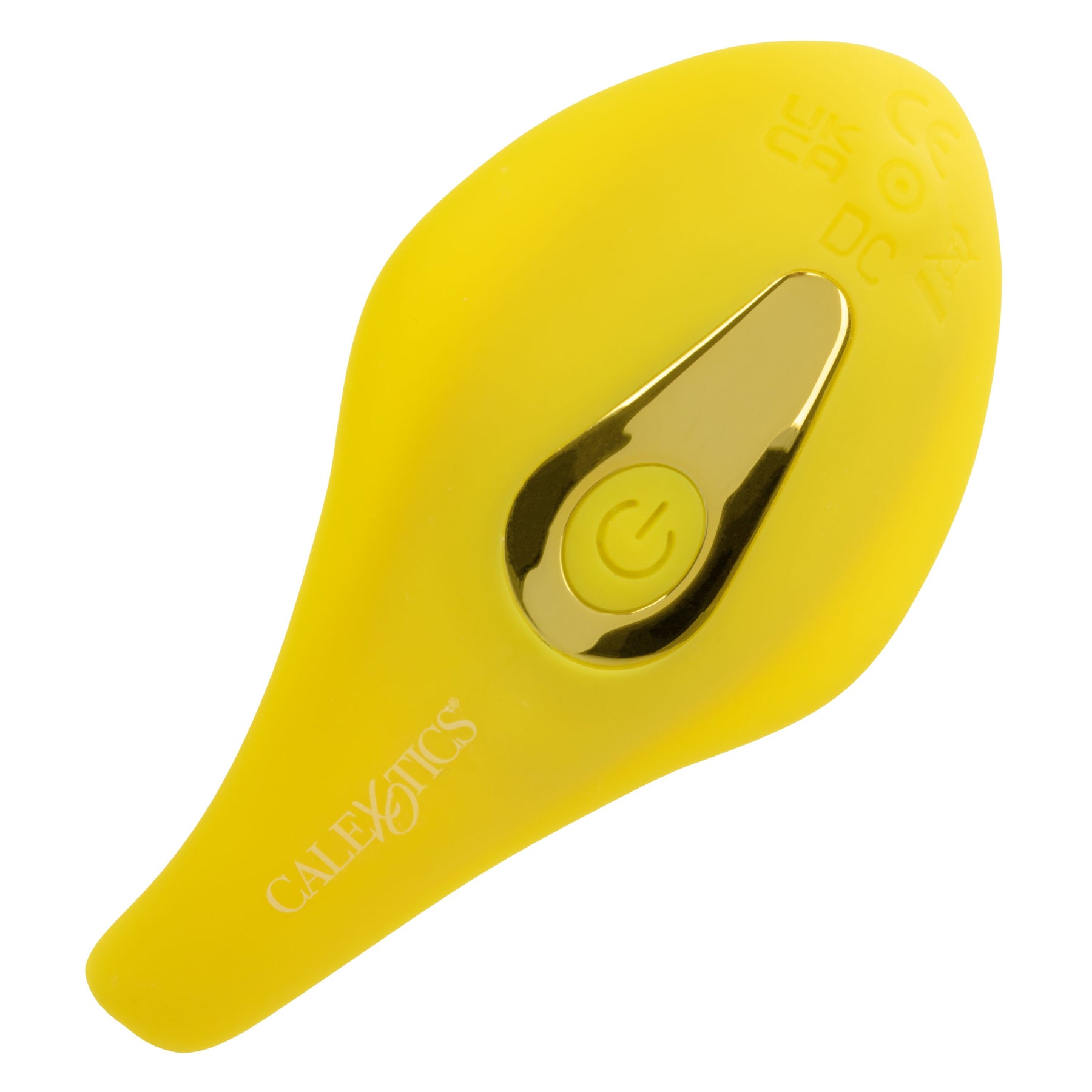 Neon Vibes The Secret Vibe Yellow Pleasure Toys from California Exotic Novelties. The Neon Vibes The Secret Vibe puts knee shaking pleasure at your very fingertips with a handy remote control! The ergonomically curved remote controlled vibrator is sure to thrill with pinpoint stimulation and full coverage vibrations. The playful vibe indulges your every fantasy with 10 functions of vibration and a unique multi-use design for versatile play with an easy to use remote control. The contoured shape and ultra plush Silicone are made to explore sensual sweet spots and pinpoint intimate desires with ease. Turn the heat up on foreplay with the teasing versatile shape that can be used as a finger vibe, panty teaser, and so much more. The discreet mini remote control makes it easy to enjoy adventurous foreplay. Once fully charged, the versatile panty teaser has an orgasmic controller range of up to 32.75 feet away! Get playful with up to 60 minutes of stimulation with every charge. Charge up your passion in only 1.5 hours by plugging the provided USB cable into the self sealing charging port on the back of the massager and the remote. The massager's discreet size makes it the perfect travel companion, letting you embrace radiating pleasure wherever your fantasies take you.