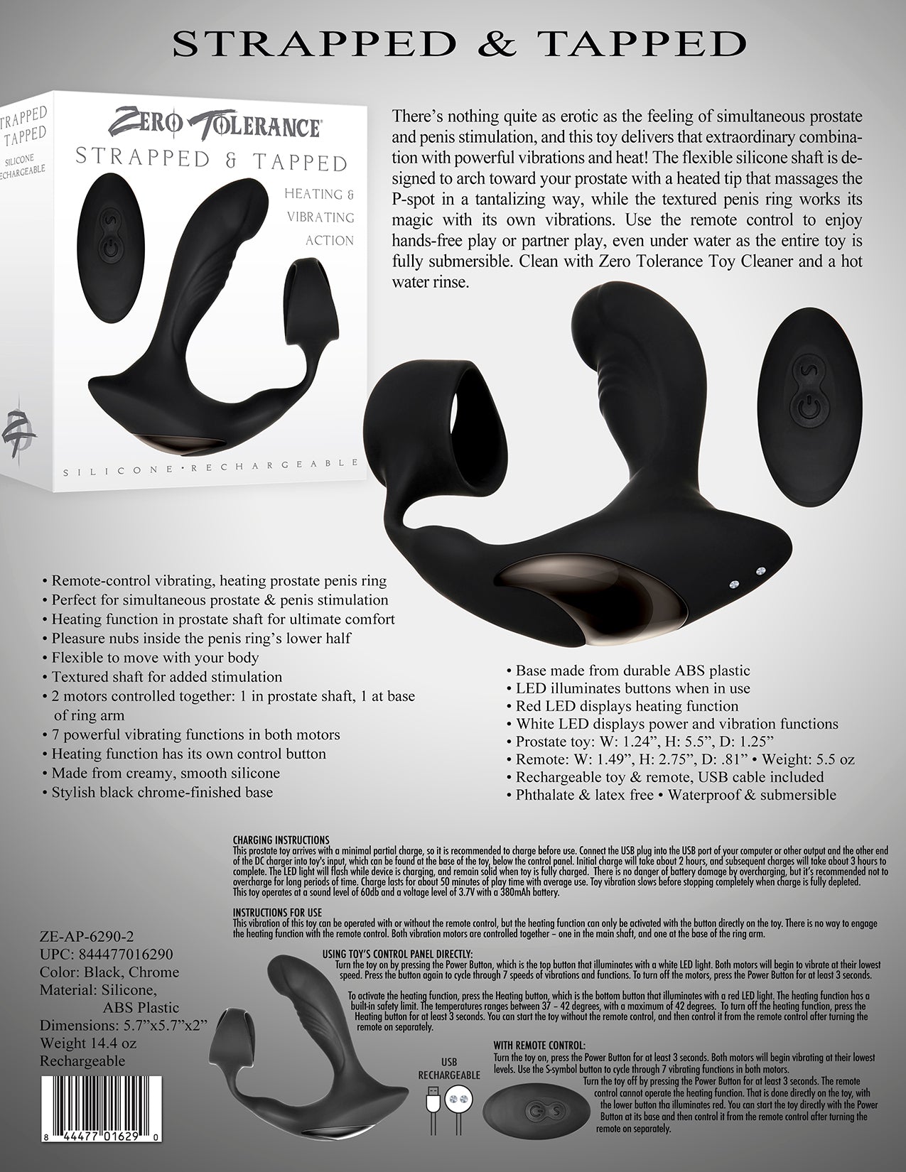 Zero Tolerance Strapped and Tapped Heating and vibrating actions Prostate Massager Black. Prostate stimulation during sex or oral sex has been proven to induce mind blowing orgasms for men, and this silky smooth vibrating Prostate toy is ergonomically shaped to reach the P-Spot with ease! There is nothing quite as erotic as the feeling of simultaneous Prostate and penis stimulation, and this toy delivers that extraordinary combination with powerful vibrations and heat! The flexible Silicone shaft is designed to arch toward your prostate with a heated tip that massages the P-spot in a tantalizing way, while the textured penis ring works its magic with its own vibrations. Use the remote control to enjoy hands free play or partner play, even under water as the entire toy is fully submersible. Clean with Zero Tolerance Toy Cleaner and a hot water rinse.
