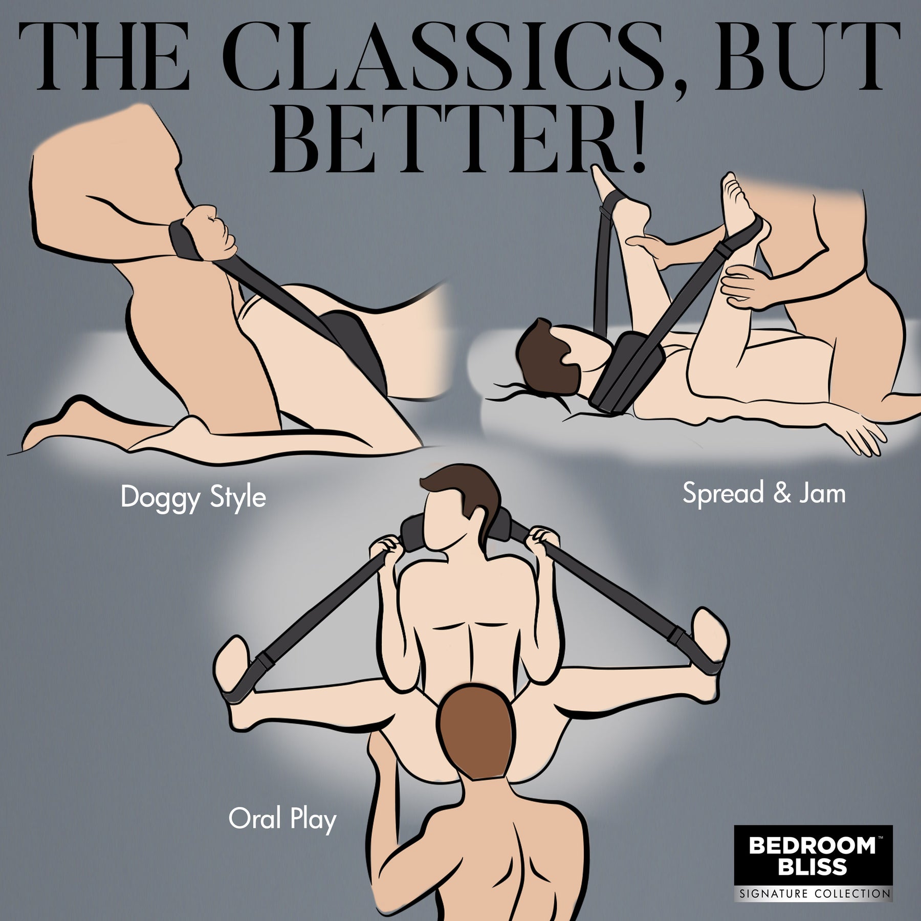 Bedroom Bliss Lover's Position Strap from XR Brands. Get ready for deeper penetration and more control in the bedroom! With this Lover's Strap you can grab your partner by the handles and pull their backside towards you in Doggy Style pose! Flip them on their back and get deeper penetration with their legs up! The wide, padded center of the strap is comfortable and plush so it cushions their body as you both pound each other! The nylon straps are durable and strong so they can handle each tug and pull. The straps are super easy to adjust for a perfect length! Keeping them clean is easy, too! Just throw it in the washing machine after each use or spot clean as necessary. Get your partner on all fours, then wrap the strap around their waist. Adjust the length as necessary and then grab hold of each loop to tug them backwards as you thrust! Doggy style never felt so good! Switch it up by flipping them onto their back! While on their back, have the padded part of the strap behind their neck and then pull their legs up, knees bent, so they can put their feet in the loops like stirrups! Adjust the length again as needed and enjoy how open their hips are, and how amazingly deep you can get as you penetrate them! Do not be surprised if it gets really wet and juicy, either! This pose makes it much easier to stimulate your partner's G-Spot or P-Spot! Measurements: Doggy strap 20 inches in length by 5.75 inches in width. Handles adjust from 12 inches to 23 inches in length. Materials: Polyester, Nylon, ABS Plastic. Color Black. Key features: padded and soft. The straps have a thick, padded section that overlaps the Nylon and is comfortable and soft against your bare skin. Pose enhancing. Helps enhance Doggy Style and can also be used wrapped around the neck with the handles around the feet for deeper penetration. Durable Nylon. Strong and flexible so you can move your partner's body around. Adjustable. Machine Washable. Easily adjust the straps for different poses and bodies. Machine wash after use for easy care and cleaning. Categories: Bondage, Fetish, Kink, Sex Swings, Machines, Erotic Furniture, Sex Toys for Couples. 2023.
