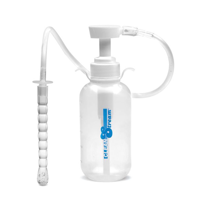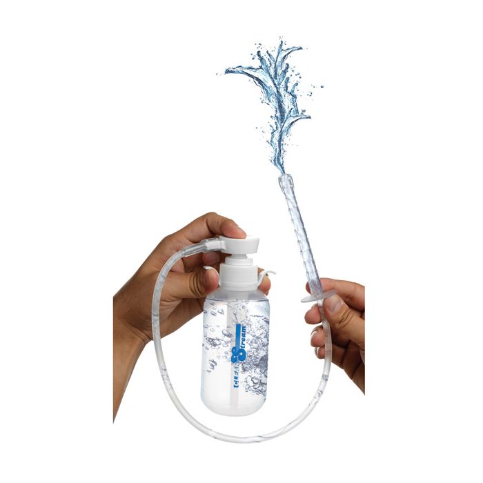 Deliver your own enema with ease and convenience! This anal douche kit includes a bottle, pump, and nozzle so that you have everything you need to clean out with more control than an enema bulb, and less hassle than a shower or gravity system. The bottle holds up to 300 mL of fluid, with measurement markers indicated on the side for accuracy. The pump includes syringe style handles so that you can easily transfer the fluid through the long, flexible tube with one just hand. Made of premium, non-porous silicone, the petite `nozzle is smooth and bulbed for comfort. Holes around the side of the tip provide more effective cleaning of your inner walls. Not compatible with silicone lubricants. Clean with mild soap and warm water after use. Measurements: Nozzle is 4.5 inches in length, .5 inches in diameter.Bottle volume is 300 mL. 7.5 inches in height with pump attached, 2.5 inches in diameter. Hose is 17.5 inches in length. Material: Silicone, polyethylene. Color: Clear. Note: Includes bottle, pump, hose, and nozzle.