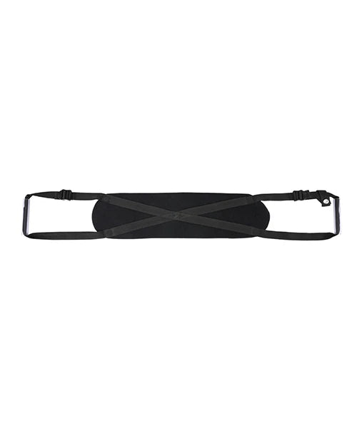 Pivot Deluxe Doggie Strap from Sportsheets. Prioritize your pleasure with the new and improved Pivot Deluxe Doggy Strap! Expanding on our signature Doggy Strap design, the Deluxe offers an extended oval padding for additional comfort where you need it most. The adjustable length handles come with a plastic grip for help keeping a comfortable and secure grip at any length. A uniquely crossed, two strap design across the front of the padding helps support the lower abdomen while in use and assists in keeping the strap in place. Revitalize Doggie Style with the Pivot Deluxe Doggie Strap. Designed to enhance intimate moments, this innovative strap gently compresses the vaginal canal, intensifying sensations and fostering a closer bond with your partner. As you pull them near, experience the relief of reduced strain on your waistline, allowing for a deeper connection and more satisfying, intense penetration. Product details: Materials: Polyester, Polypropylene PP Webbing, POM Plastic, Iron, PVC, Polyethylene PE foam. Color: Black.