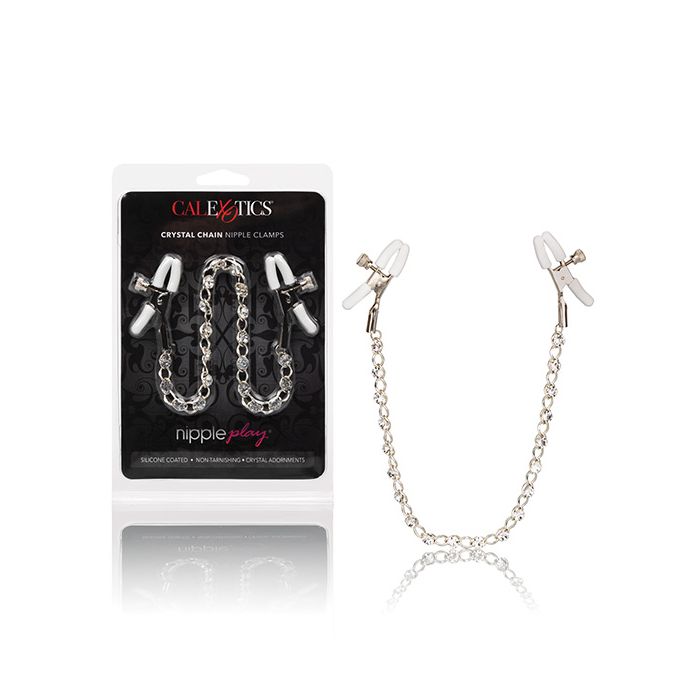Push sensation to the next level and enjoy teasing nipple play with the Nipple Play® Crystal Chain Nipple Clamps; Explore elevated sensation with the 2 fully adjustable nipple clamps, teasing chain and sparkling crystals. Reach new levels of playful pleasure with the adjustable clamps; Clamp the naughty clasps to your body and enjoy every rush of pain and pleasure. The teasing clamp has adjustable tension to stimulate anywhere on your body for playful teasing; As the tension tightens, the tingles intensify with every turn of the dial for the ultimate in nipple stimulation toys. With the teasing clamp stimulation and increased blood circulation, you can look forward to amplifying nipple sensitivity and intensify overall arousal; These easy-to-use nipple teasers are great for him or her. The two adjustable clamps are made from nickel-free iron with silicone cote, an nickel-free iron chain and Silica crystals.