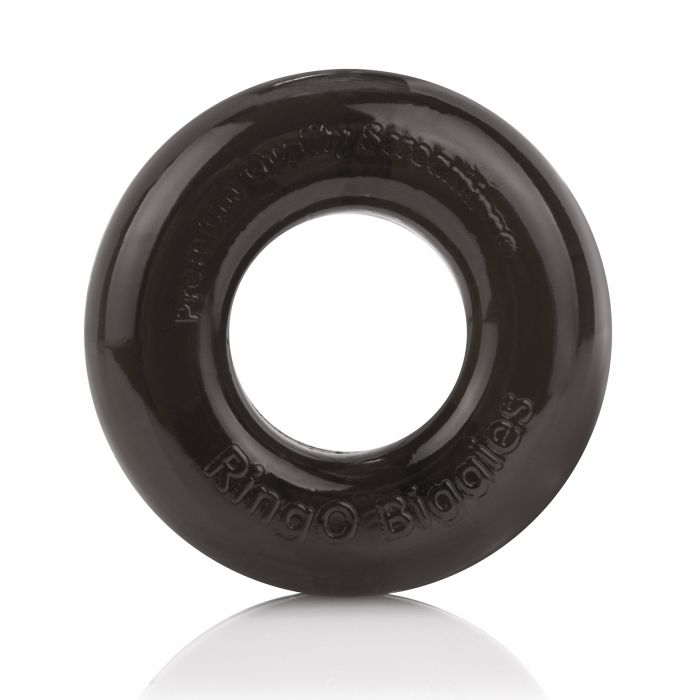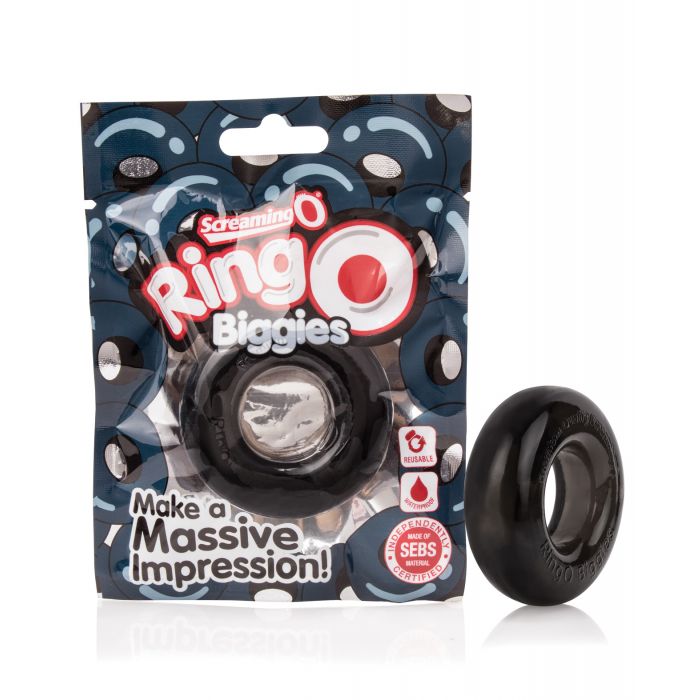Colossal cock ring that makes a massive impression. RingO Biggies are a thicker version of one of our more popular cock rings and feature a tighter, firmer fit that makes a massive impression. These stretchy cock rings offer simple, no-frills enhancement that can be worn either around the penis or the penis and testicles - you choose how you'd like to look and feel! Whether enjoying longer-lasting sex with a partner, amping up endurance training, boosting masturbation, or sporting a more prominent package, RingO Biggies are the premium choice for impressive results. From Screaming O. Black.