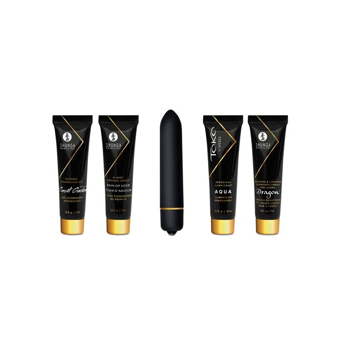 Explore your Naughty Side. This collection of miniature products will help you explore and break all taboos. Nothing surpasses the desire to discover the lust of flesh by yourself or with your lover. Collection includes: Toko aqua personal lubricant, Secret Garden clitoral enhancing gel, Dragon warming and cooling sensations cream, Rain of Love G-spot arousal cream, 10 speed vibrating bullet ( requires 1 AAA battery - not included)