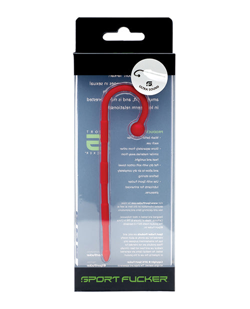 Looking to try to bust your final sex-cherry? Sounding is quickly becoming one of the fastest growing fetishes among men. You already spend half of your free time rubbin’ and tuggin’ on your best appendage. Why not stimulate it from the inside? Not into traditional medical play? No problem. With our 100% medical grade premium silicone sounds, your best man and its urethra will thank you! All the metal benefits of an ultra-smooth surface and ability to sterilize without the cold, non-bending attributes of a traditional metal sound. This great plug has three cylindrical ridges slightly raised wider than the shaft. What makes this plug unique is the curved handle that goes over the head of your cock and rests with its ball right on your frenulum glan. This is a great sensation of both internal and a slight external stimulation. Plus, it looks hot to see the handle sticking out, knowing your throbbing member is stuffed with the Ultra Sound. Be sure to only use these great toys with sterile lube. Material: Silicone Dimensions: Length: 12.7cm. (5 in.) Ball: 1cm. (4 in.) Shaft: 4.35mm.-4.6mm. (.17-.18 in.) Ridges: 5.1mm-5.2mm (.2-.21 in) Tip: 5.2mm. (.21 in) Distance from ball to shaft: 2.3 cm. (.9 in)