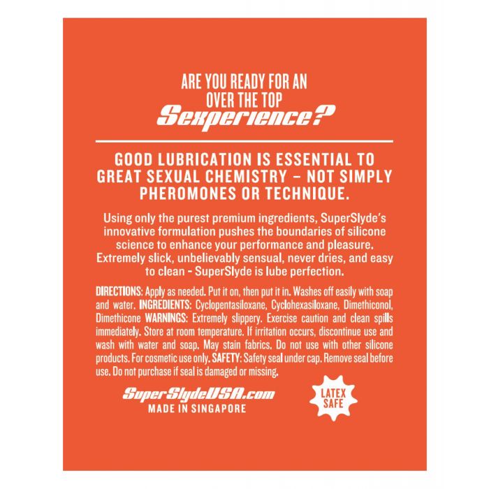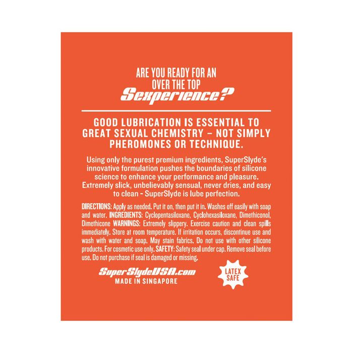 Just a touch of SuperSlyde Silicone lubricant is all you need for long-lasting ease no matter how hard you play. This special blend contains four lubricating silicones that spread thinly and easily filling every crevice of the skin it touches. SuperSlyde stays slick and silky through heat and friction but washes away easily with soap and water. Latex safe. Dermatologically tested, non-irritating, hypoallergenic and suitable for sensitive skin. Ingredients: cyclopentasiloxane, cyclohexasiloxane, dimethiconol, dimethicone Not for Sale on Amazon or eBay