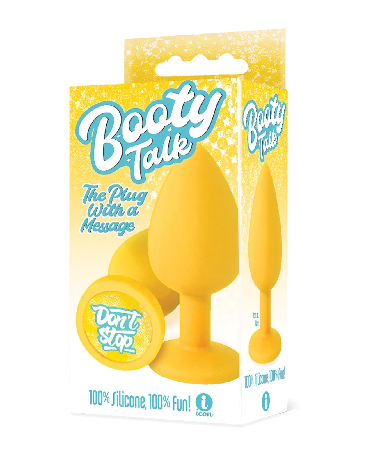 The 9's Booty Talk Butt Plug Yellow Dont Stop from Icon Brands. Made using body safe phthalate free materials Silicone. The plug with a message. 100% silicone. 100% fun..One Year Warranty.