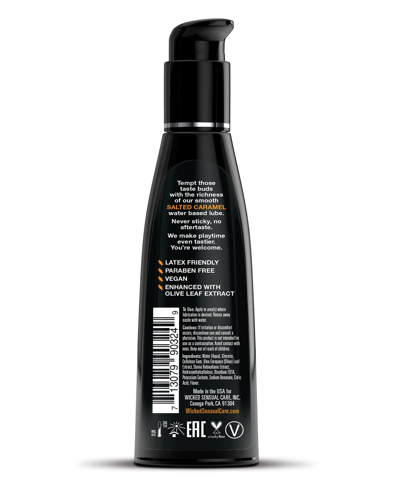 The perfect combination of savory and sweet! Kissable, lickable, and delicious, Wicked Aqua Salted Caramel personal lubricant adds subtle and delicious natural flavors to enhance oral pleasures. Light and silky, this water-based formula is the perfect sensual combination of an elegant lubricant and a flavor sensation. Never sticky and without an aftertaste, Wicked Aqua Salted Caramel satisfies your sweet tooth and your intimate desires all in one amazing pleasure product. Oral sex never tasted so good. Whether you are giving or receiving, our flavors will give you a new sexy confidence.