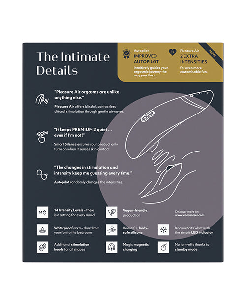 Womanizer PREMIUM 2 with the original Pleasure Air technology is our most luxurious creation yet – truly the Prada of sex toys, the ultimate toy for women who are looking for more than just another device to play with. With more intensity levels than ever before and an improved Autopilot function to take you on new, unpredictable adventures, PREMIUM 2 is the purest pleasure at the highest quality.