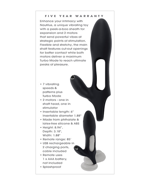 Enhance your intimacy with Nautilus, a unique vibrating toy with a peek-a-boo sheath for expansion and 2 motors that send powerful vibes at strategic points of stimulation. Flexible and stretchy, the main shaft features cut-out openings for better contact while both motors deliver a maximum Turbo Mode to reach ultimate peaks of pleasure.