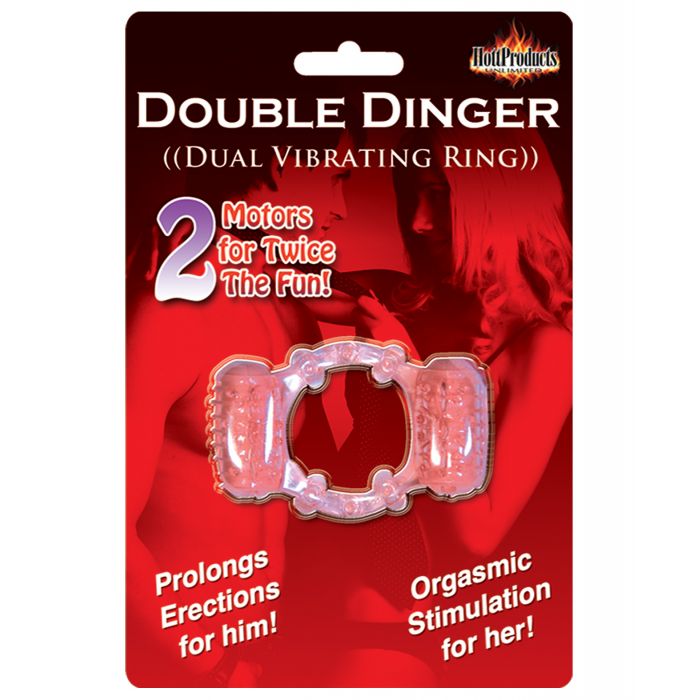 Twice the hummer! Humm Dinger Double Dinger is made of stretchy jelly. The erection enhancer fits around the base of the penis shaft. Two removable 1.125" x .5" bullets stimulate the testicles and clitoris. Each bullet has easy on-off control and lasts 40-plus minutes. Available in purple and magenta.