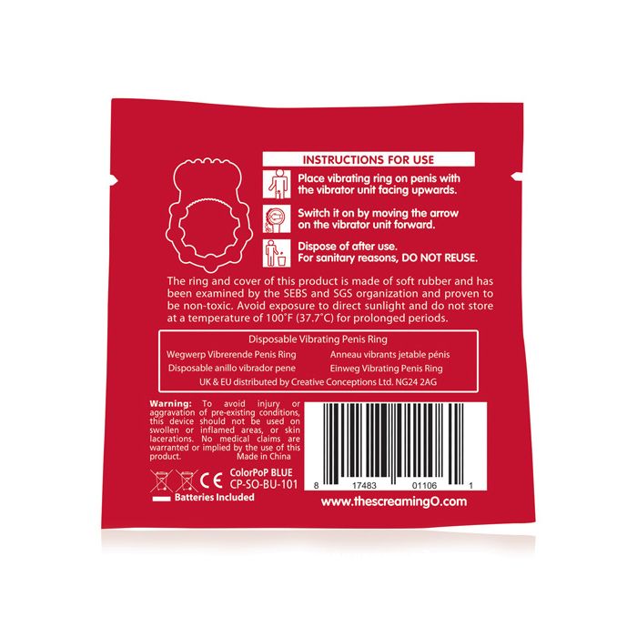 The Screaming O Vibrating Ring is the award-winning sex secret that helps couples have better, more satisfying sex! With pleasure knobs for him and ticklers for her, couples enjoy mutual stimulation with vibration that buzzes throughout the entire ring. Now available as a convenient ColorPoP Quickie, couples can enjoy vibrant vibration at home or on the go with a disposable design they can take anywhere!